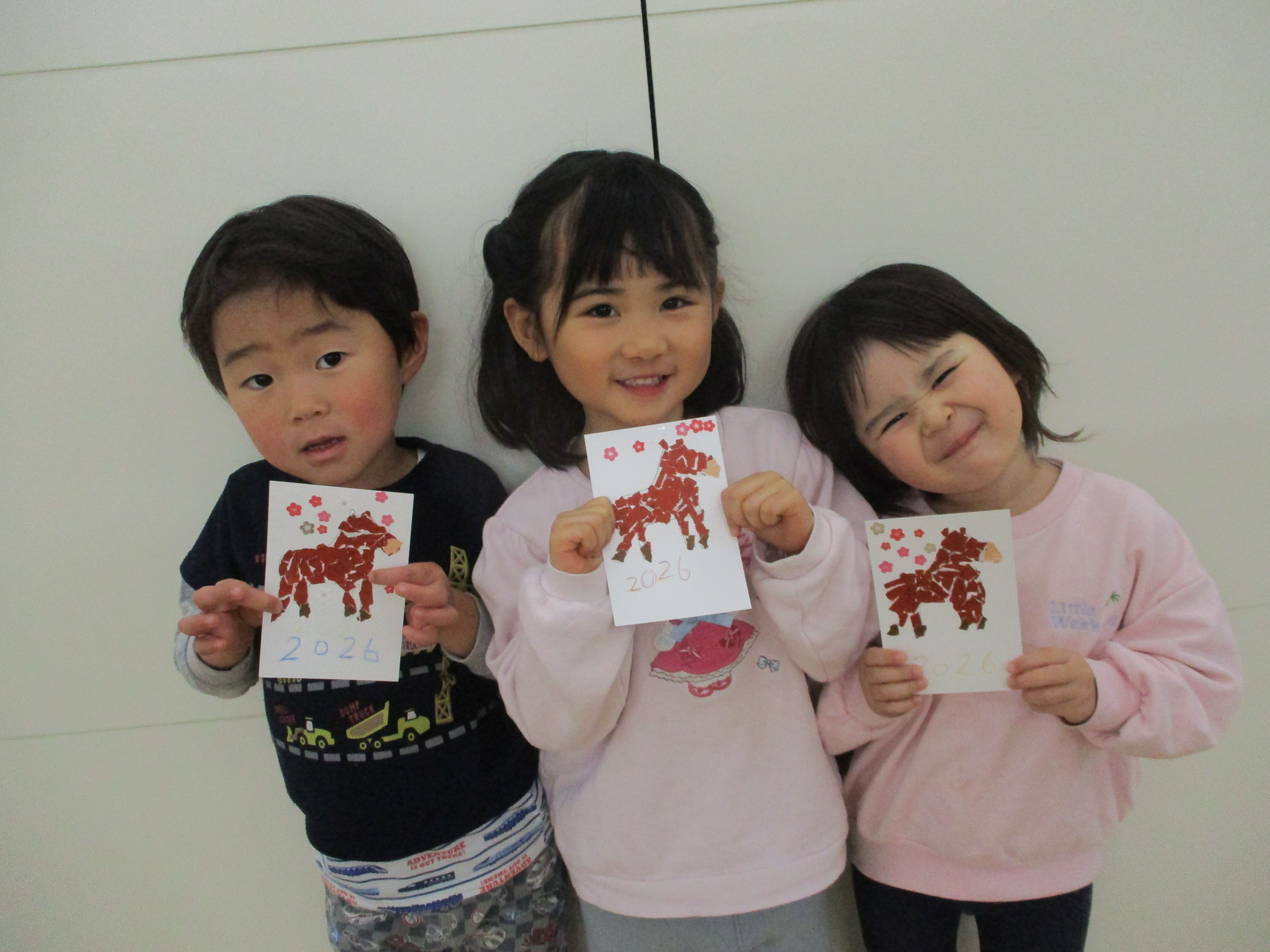 来年は午年。 山の子くみはちぎり絵で馬をつくりました。 折り紙を細かくちぎって 年賀状に貼っていきます。 色鉛筆で「20…