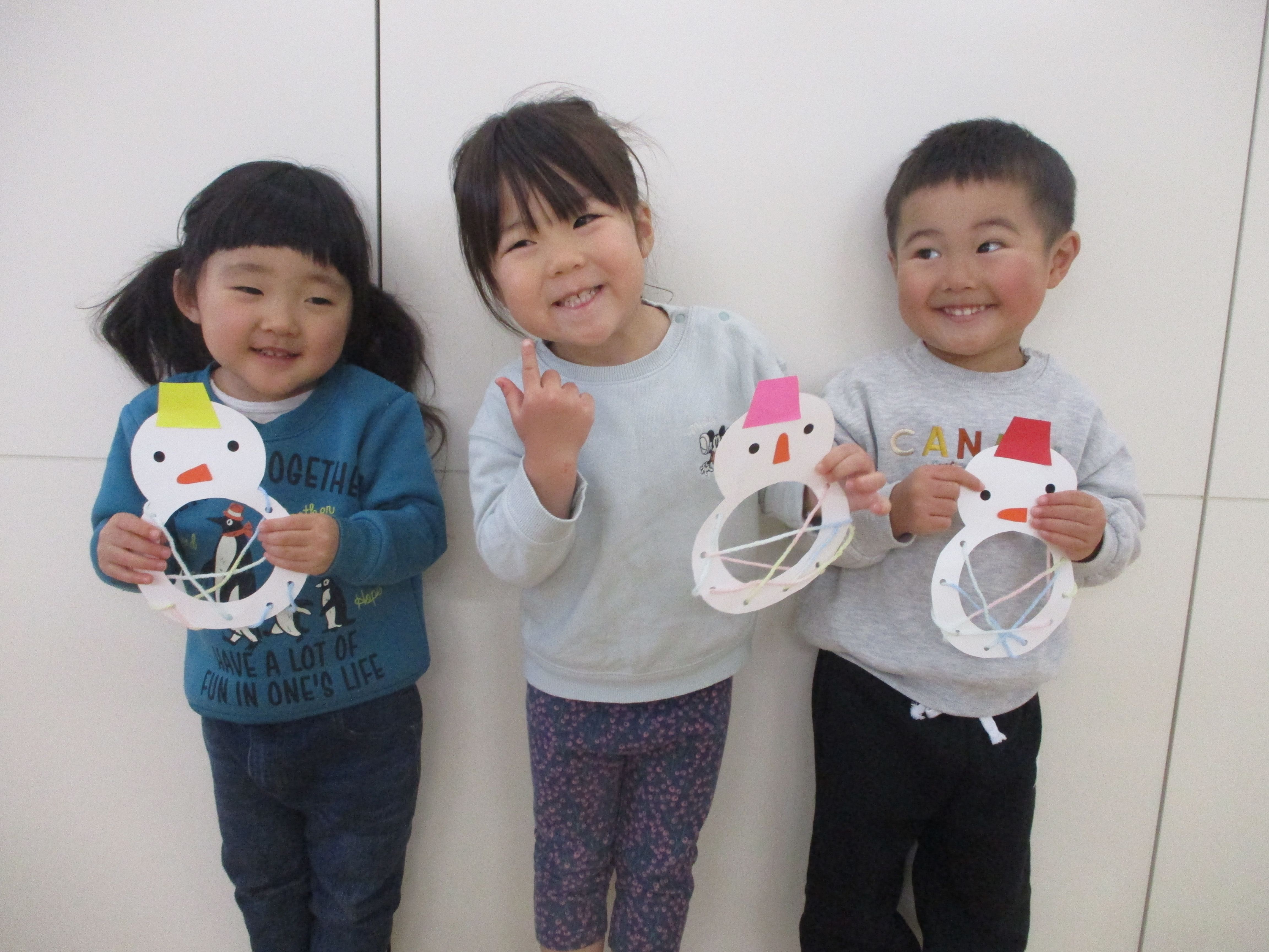 今回の壁面製作ではみんなで雪だるまをつくりました! 一日目は穴に毛糸を通して、雪だるまの模様にしていきます。 長い毛糸に…