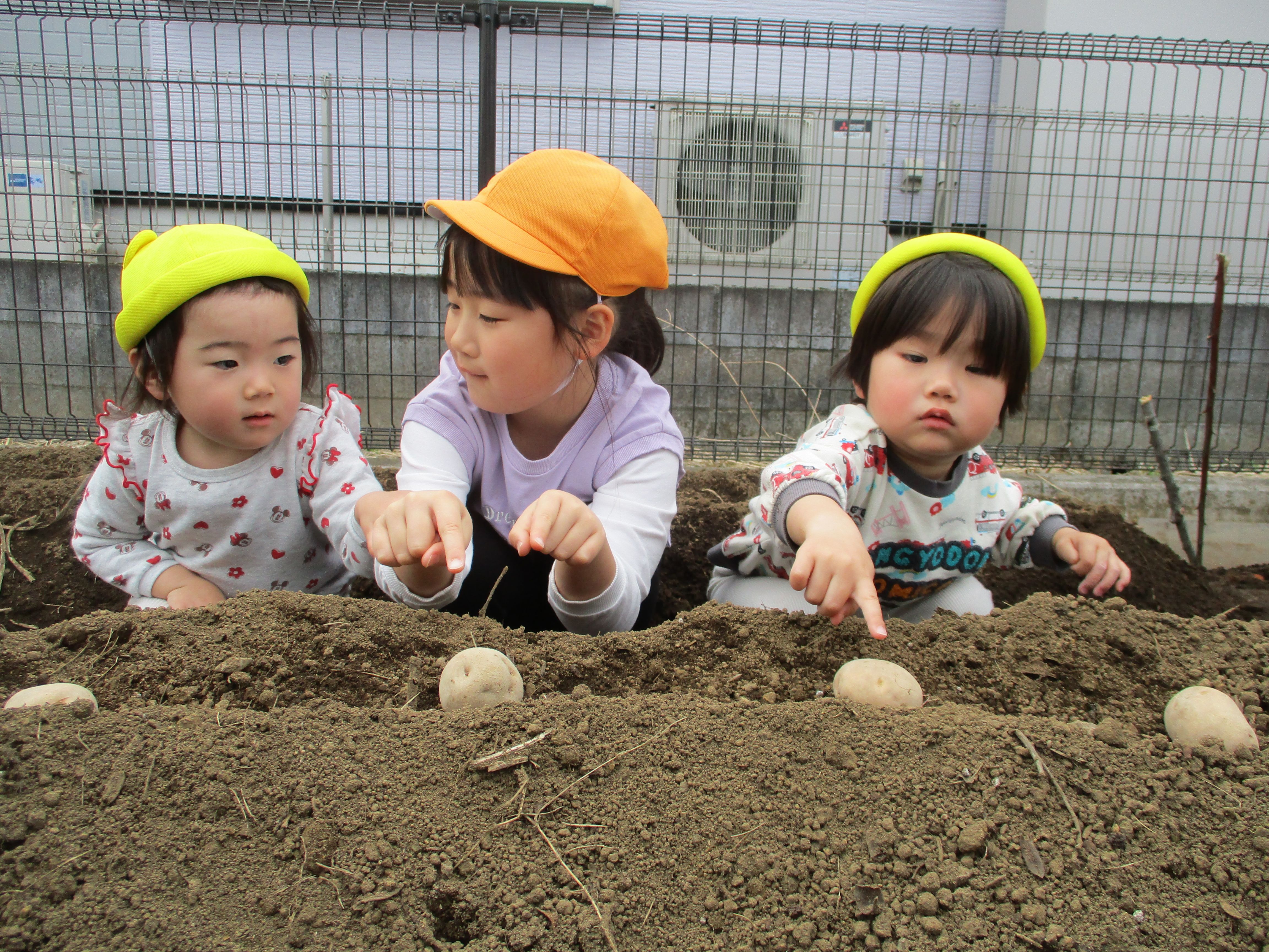 保育園のお友達みんなでじゃがいもの種イモの植え付けを行いました。 宇宙の子くみのお友達は星の子・大地の子くみのお友達と一…