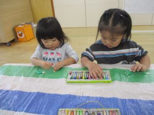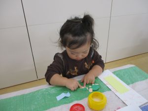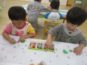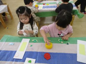 亀や葉っぱ、花、千代紙を糊で一生懸命貼っていた海の子くみのみんなです😊