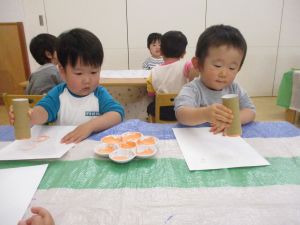 白い画用紙にトイレットペーパーの芯でスタンプをし、
