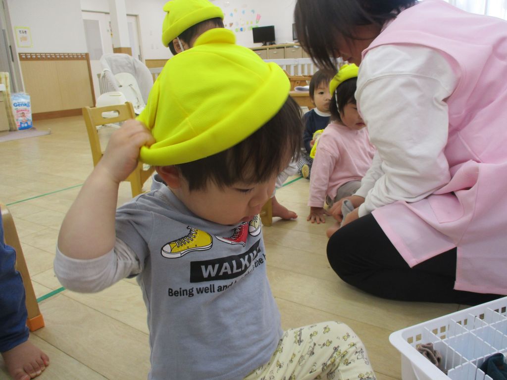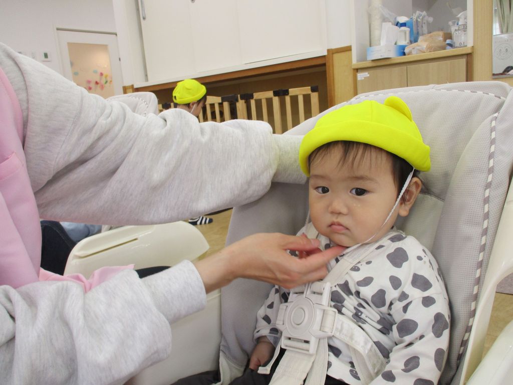 0才児は保育士と一緒に、1歳児は自分でやろうとする姿が見られます。