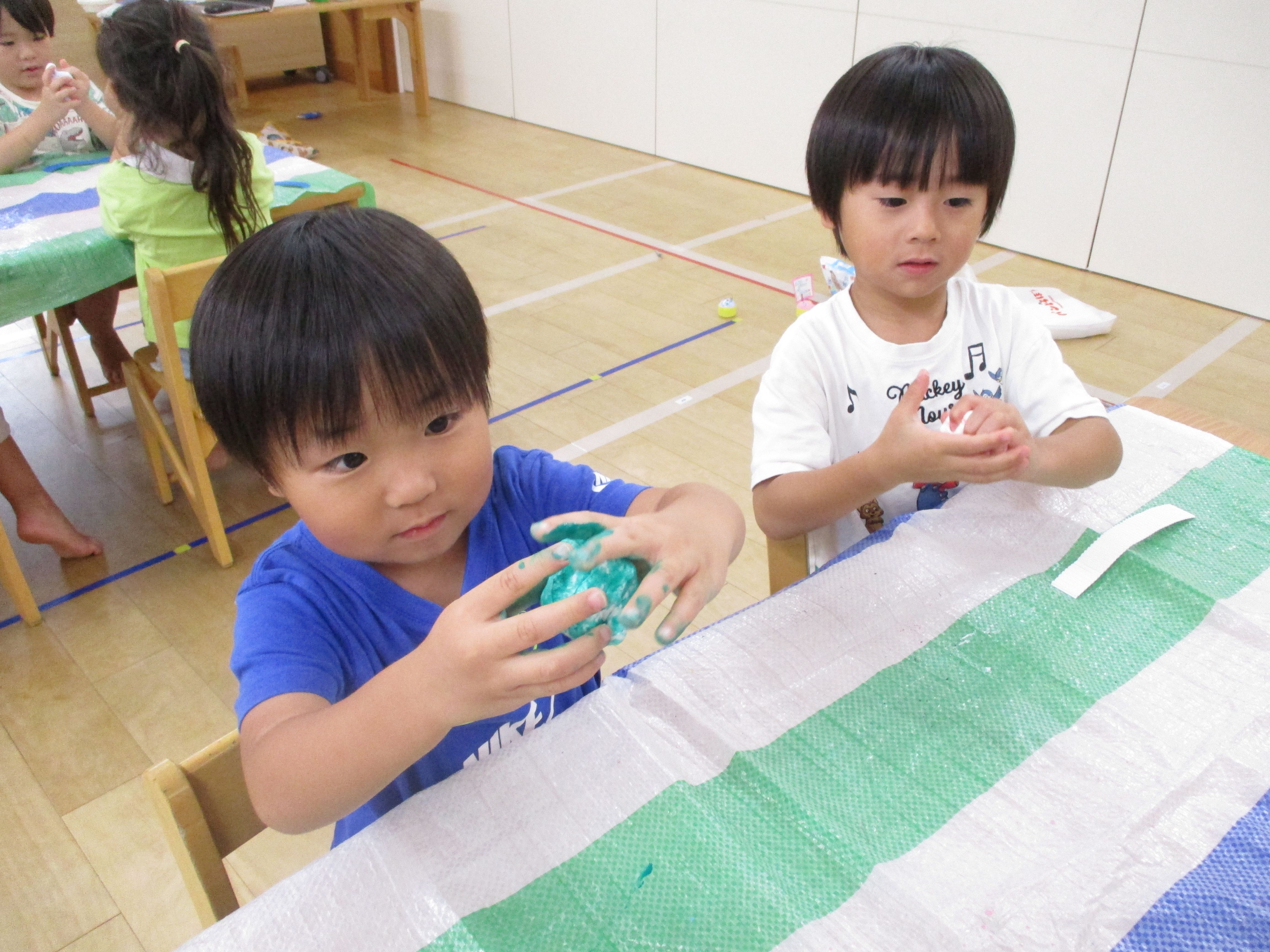 好きな色の絵の具を紙粘土に入れ、よくこねます。