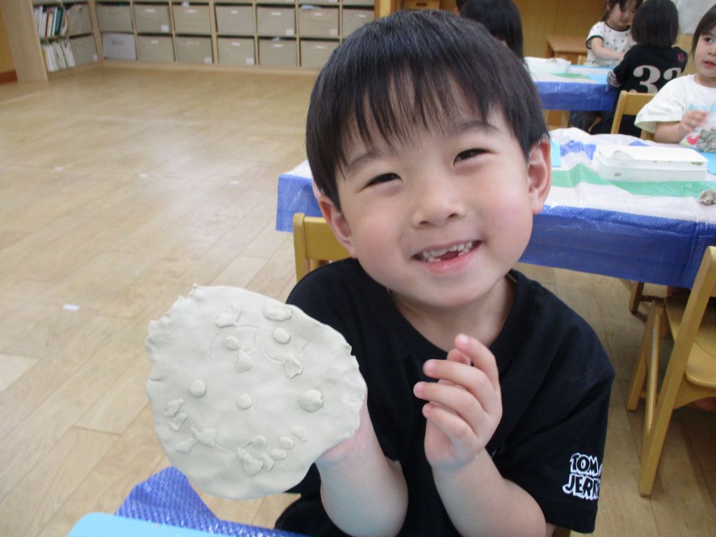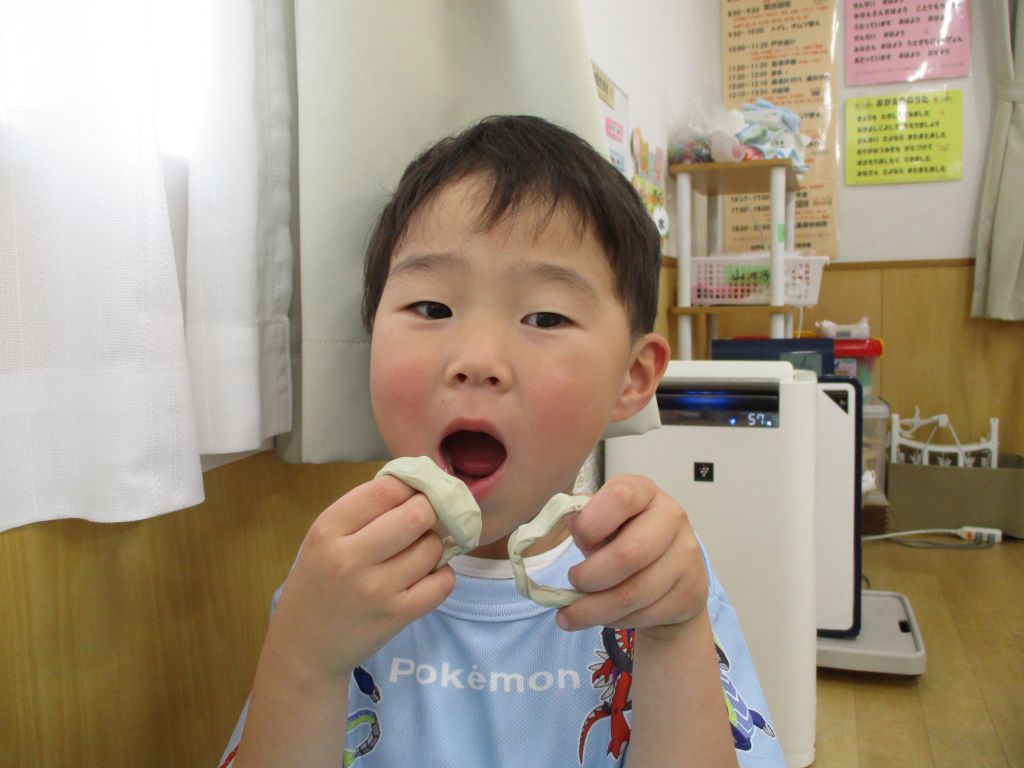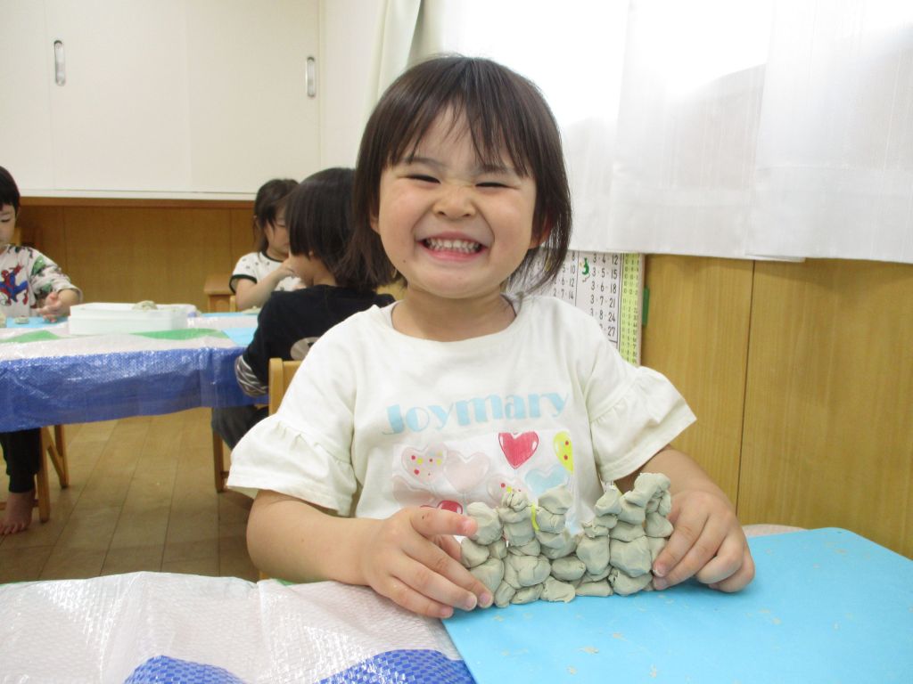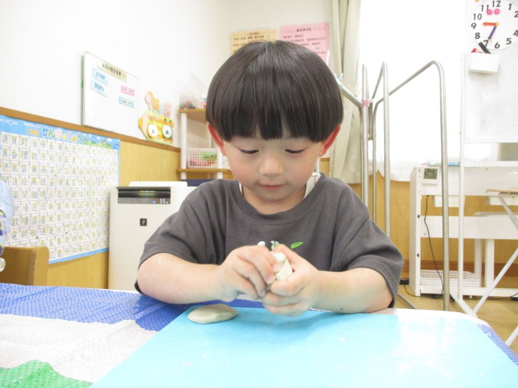 設定保育で、粘土遊びをしました。今日のテーマは「たべもの」です。