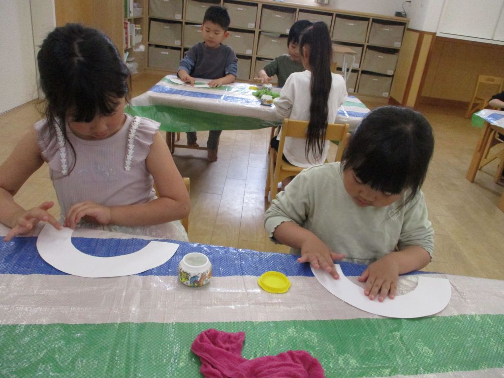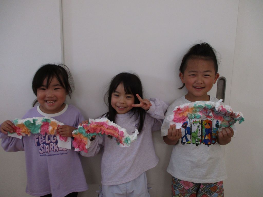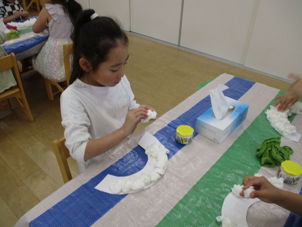 虹の形の台紙に糊を塗り、その上にティッシュペーパーを丸めて乗せ、