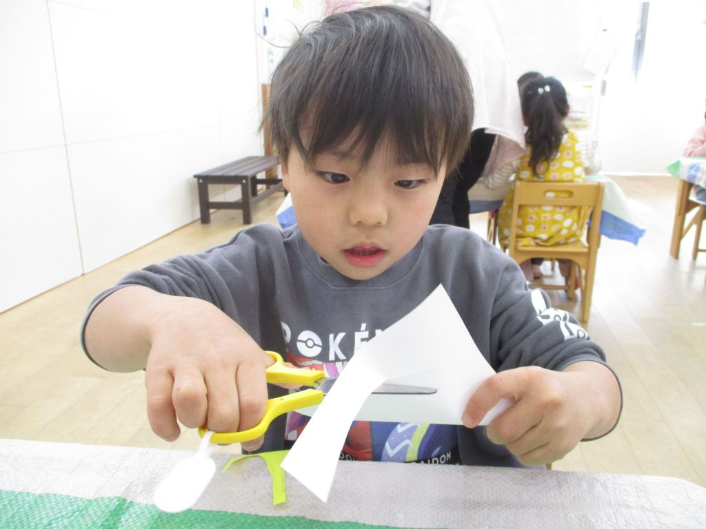 はさみを使って角や頭の部分を切り、折り紙をちぎって髪の毛を作りました。