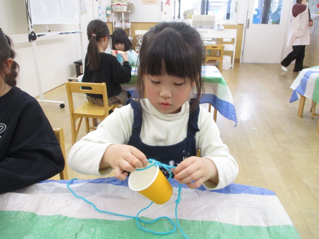 紙コップに顔を描いたら髪の毛は毛糸で作ります。