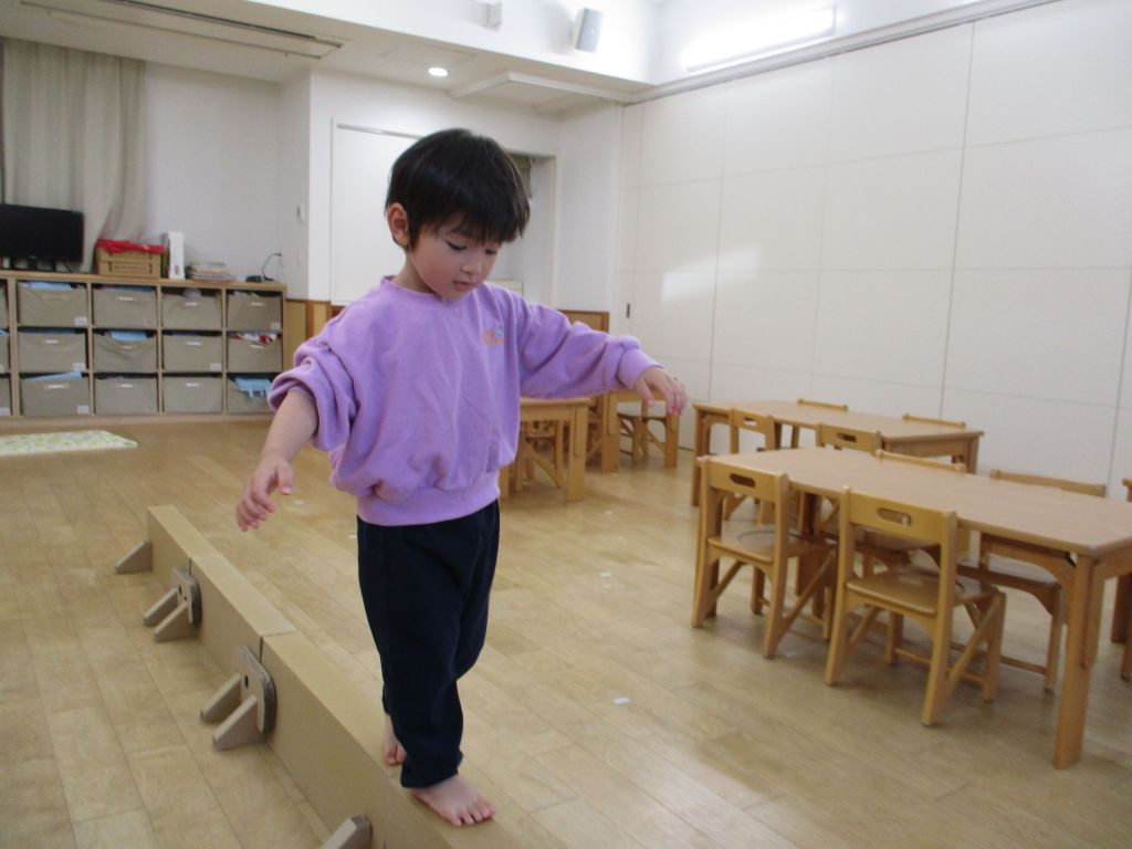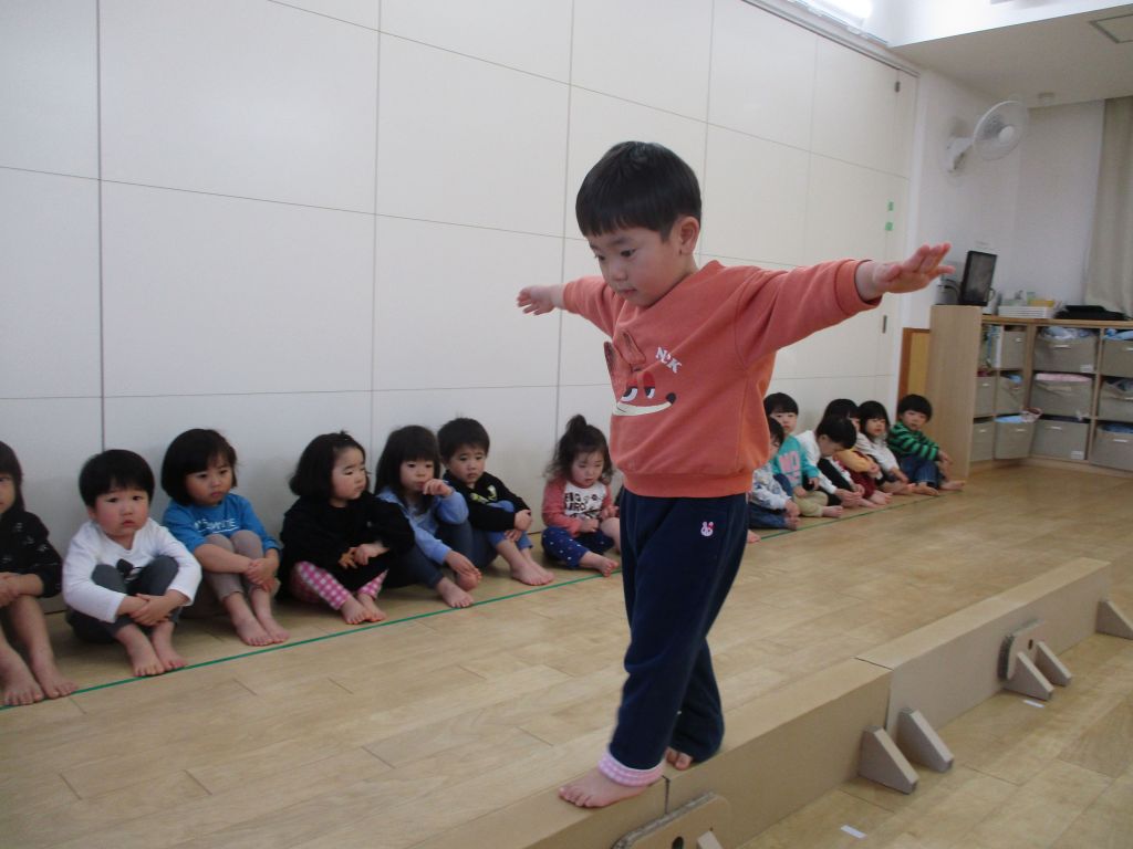 両手を広げてバランスを取りながら平均台を渡ります😊