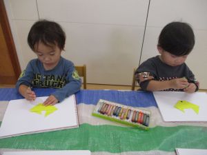 きつねに丸シールで鼻を貼り、クレヨンで目などをお絵かきして完成です。