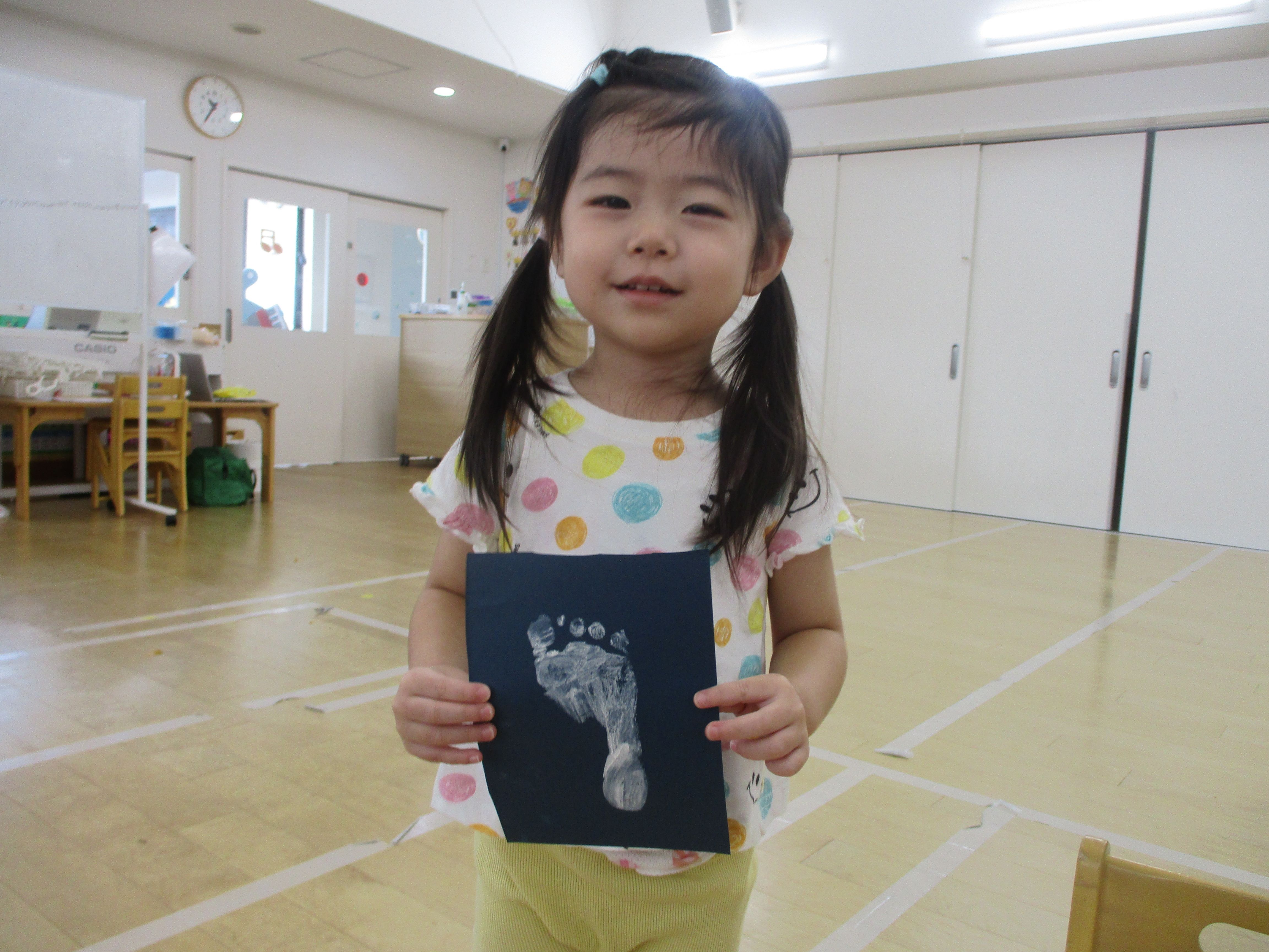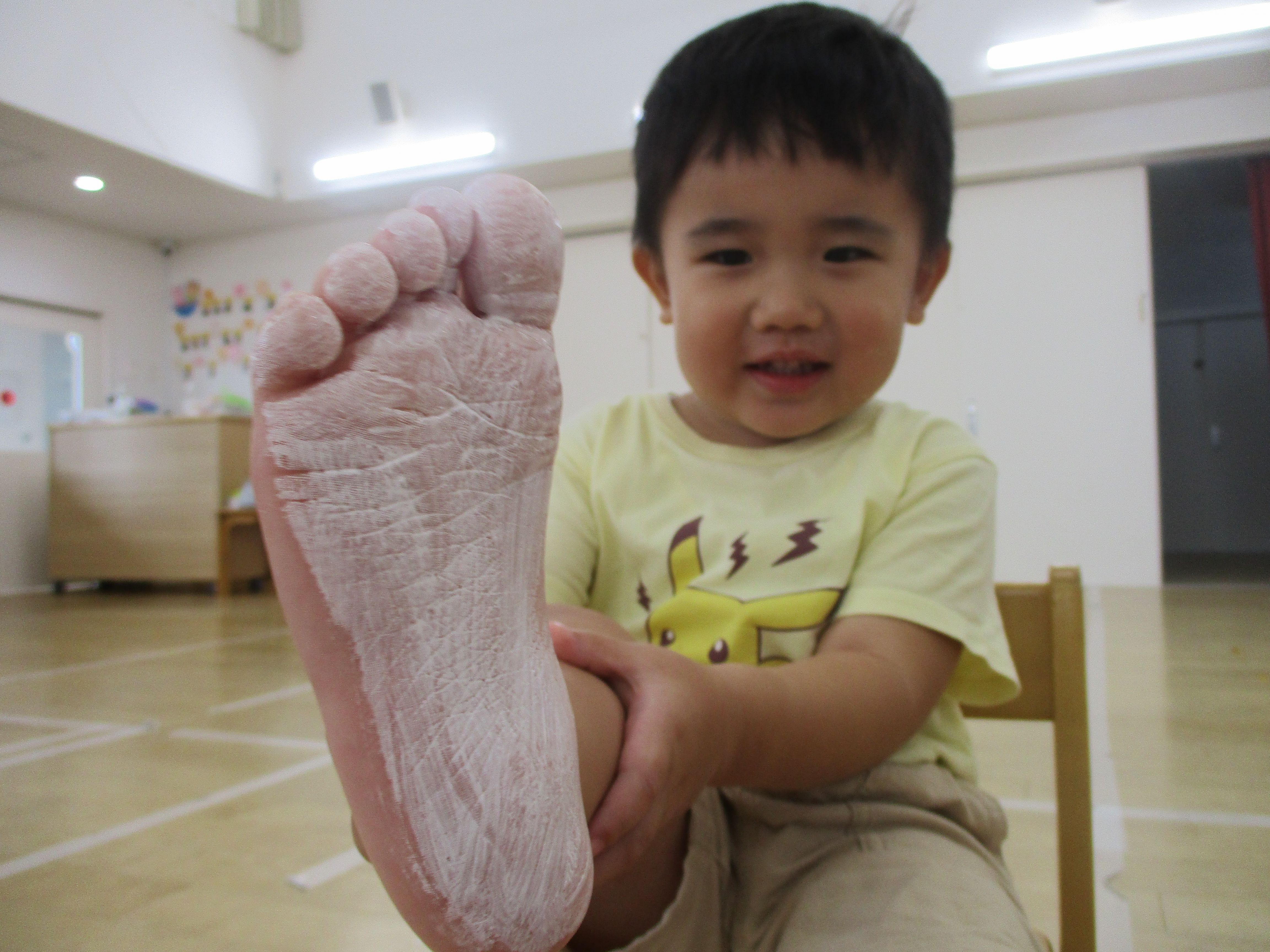 最初にウサギになる足に白い絵の具をつけてぺったん!と可愛い足形がとり