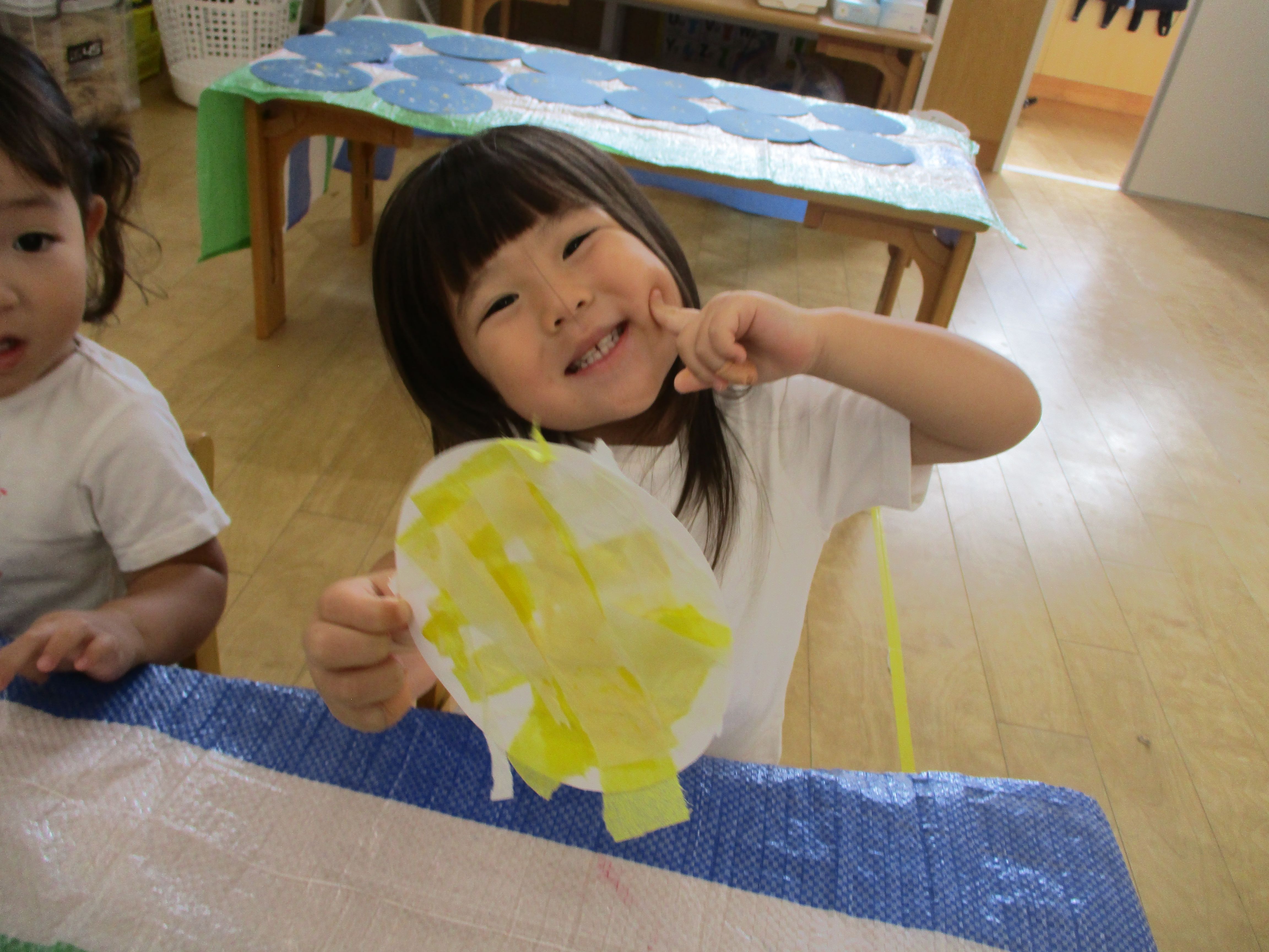 最後に二色のお花紙をちぎってお月様になるように貼っていきます。