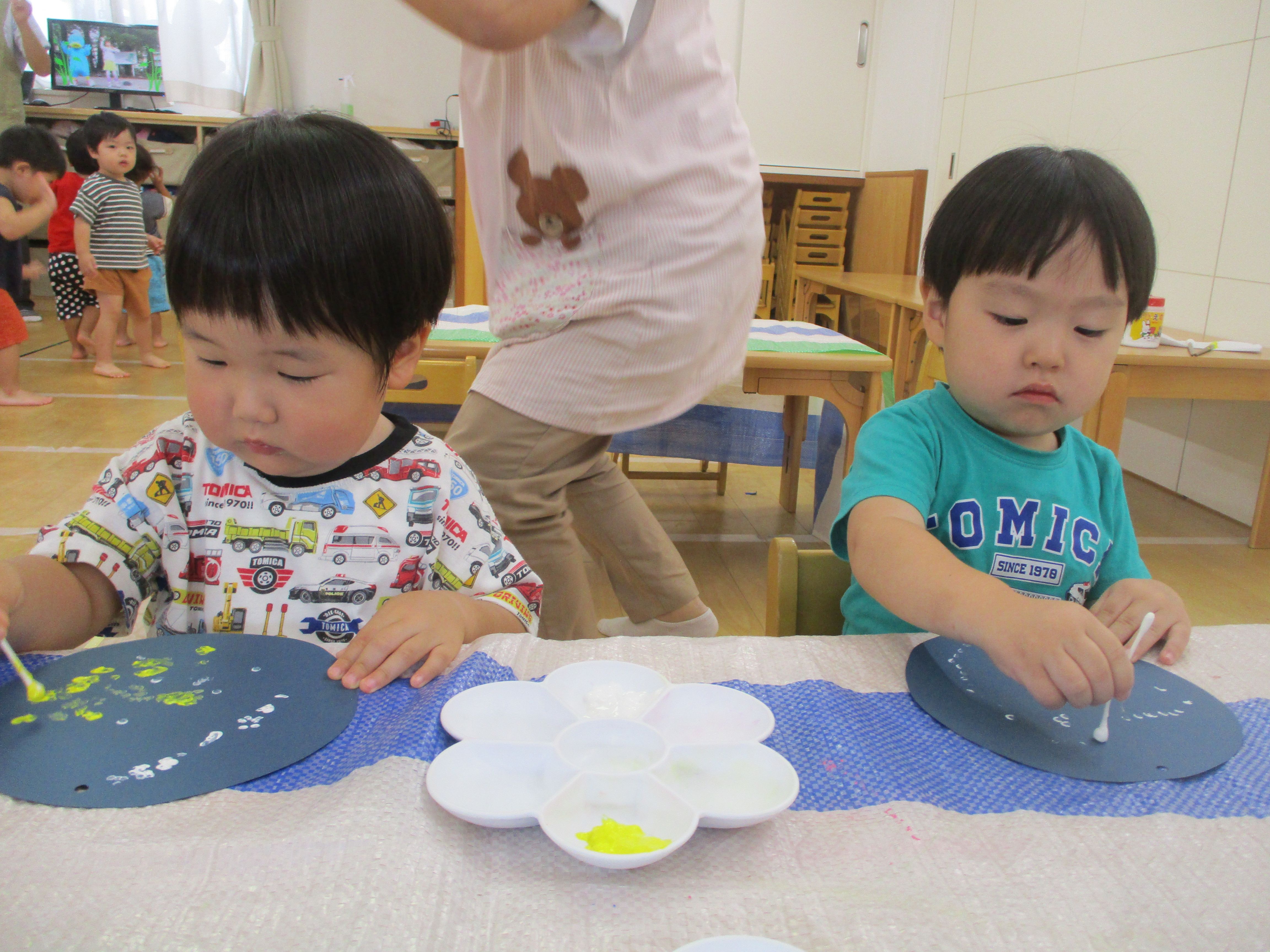 次に綿棒の先に絵の具を付けて、白や黄色のお星さまを描き