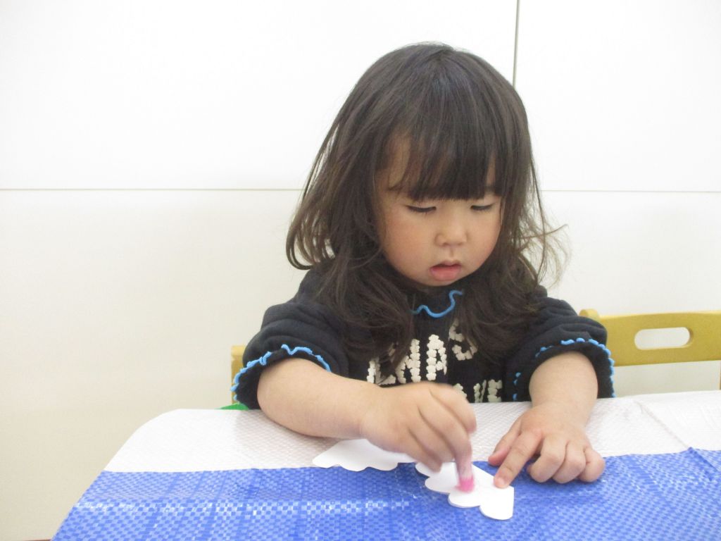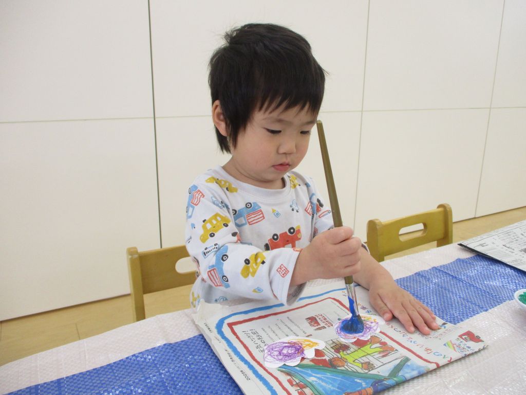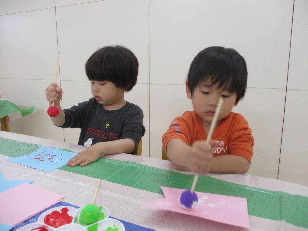 1日目は、スポンジに絵の具を付け、こいのぼりの体にタンポをし