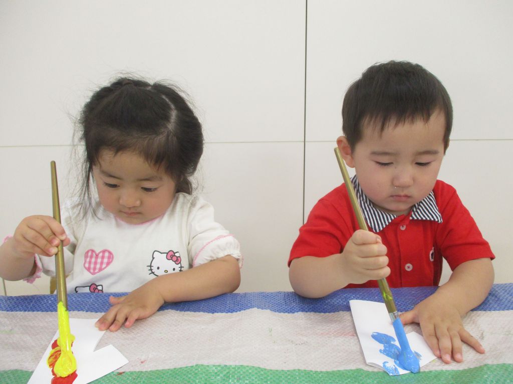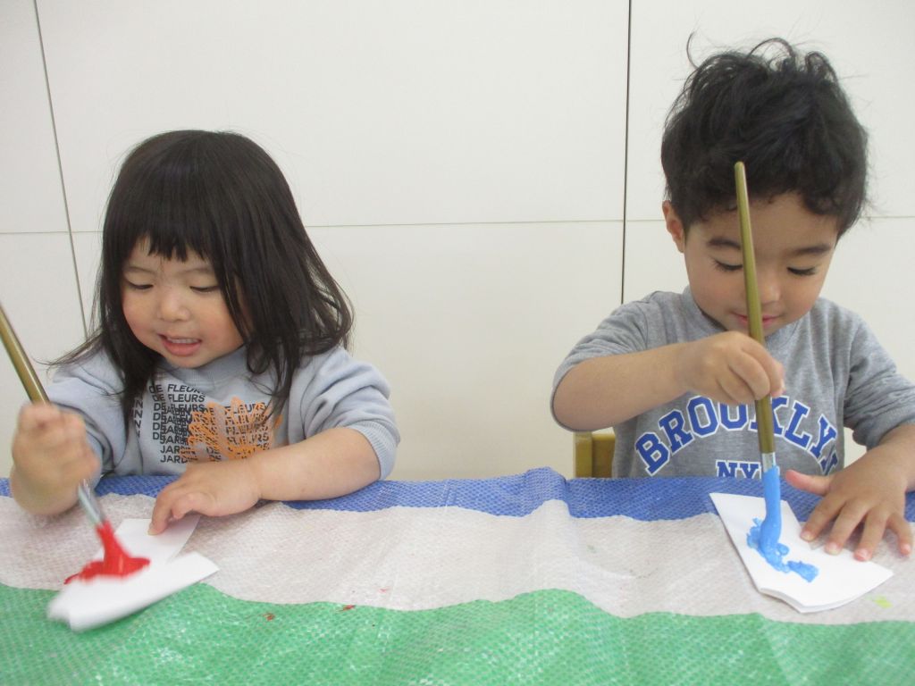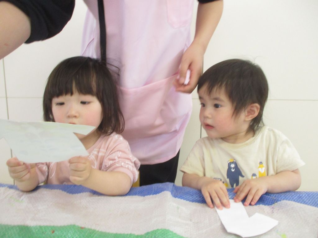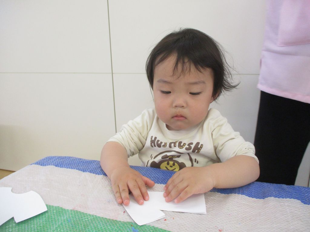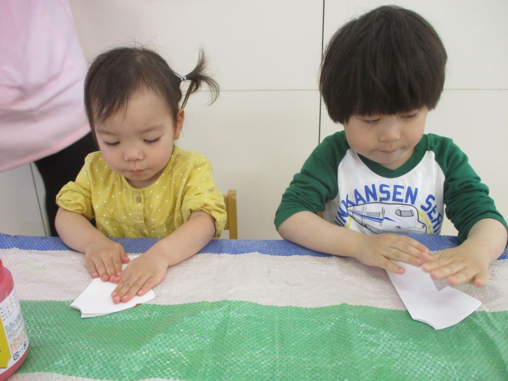 絵の具を付け終わったら、絵の具の面を内側にして折りたたみます。