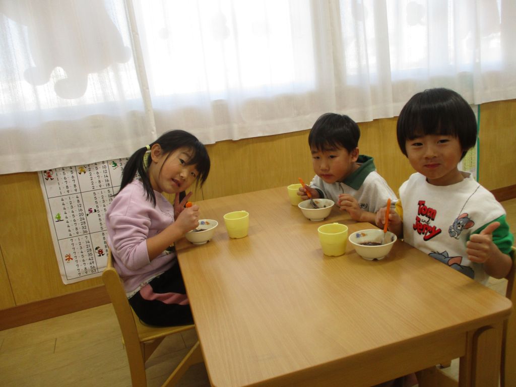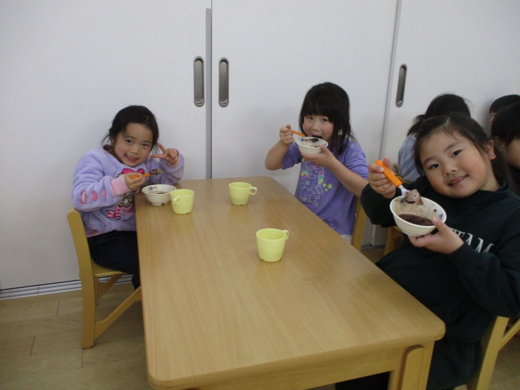 おやつのおしるこを「あまくておいしい!」と食べていました。