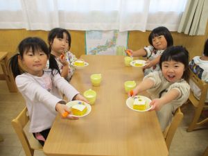おやつはイギリスの伝統菓子、キャロットケーキでした。「イギリスですか?」と嬉しそうに食べていたお友達です。