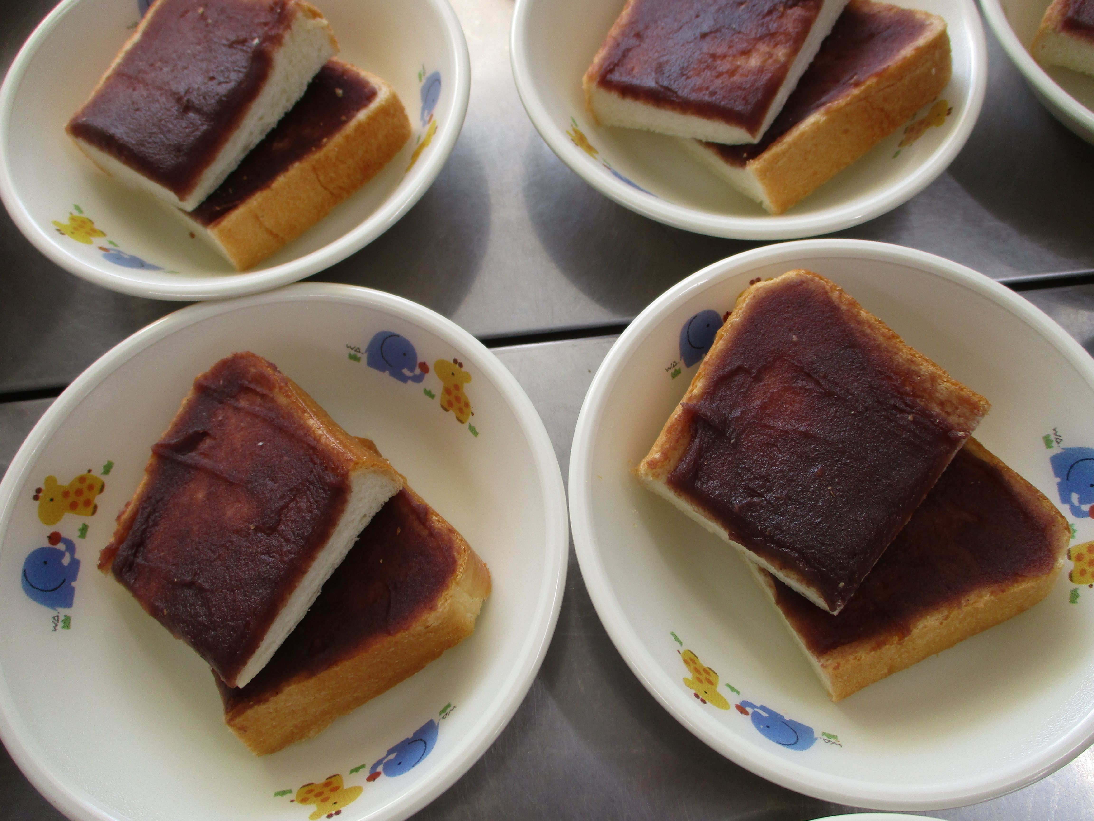 おやつのあんバタートーストと牛乳を紹介します♪ 給食室からバターの香りが広がり…