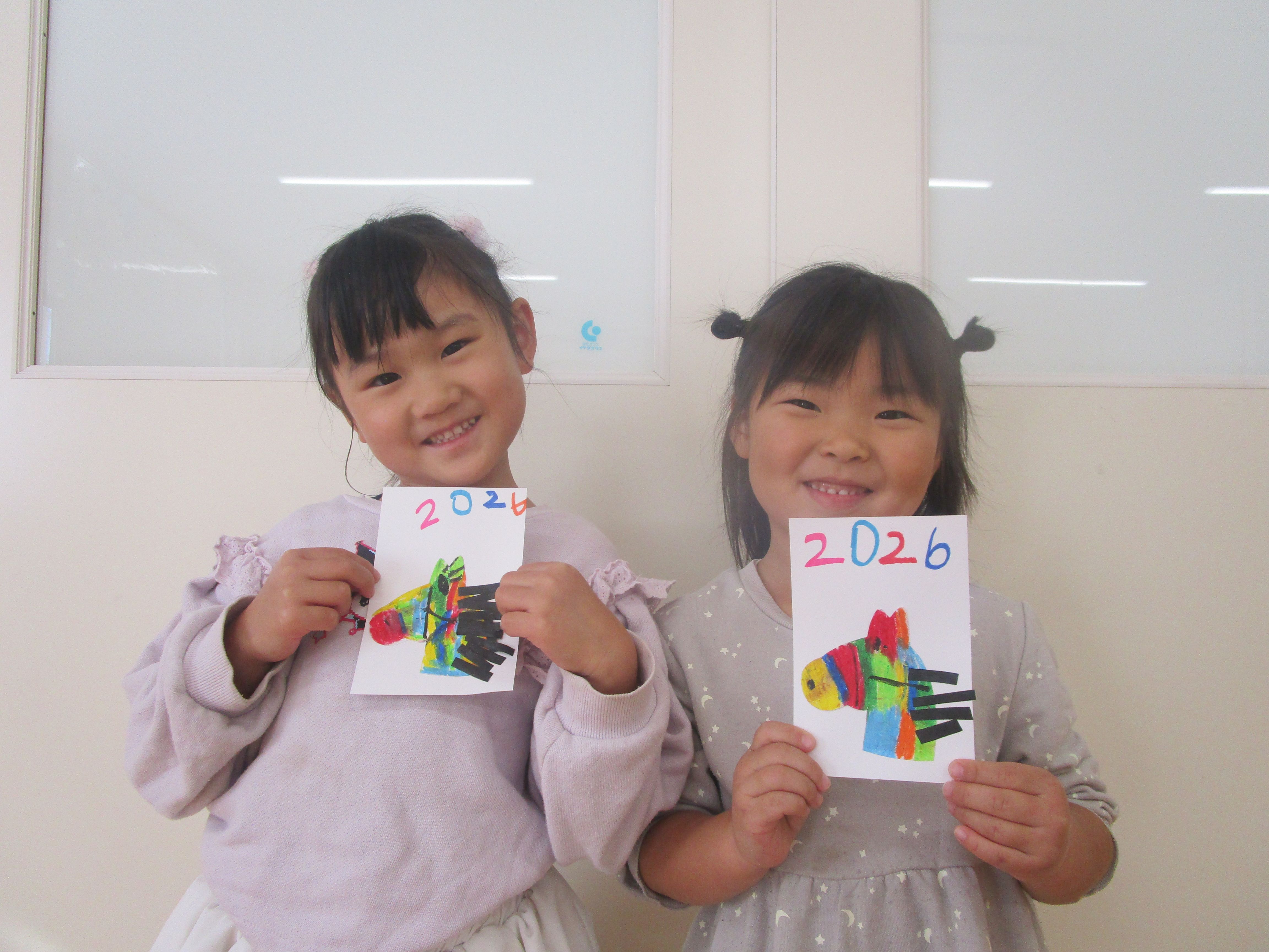 新年に向けて年賀状製作を行いました🎍 来年は午年🐴 まずは馬にクレヨンで好きな色を塗ります🖍🎵 色の境目をこす…