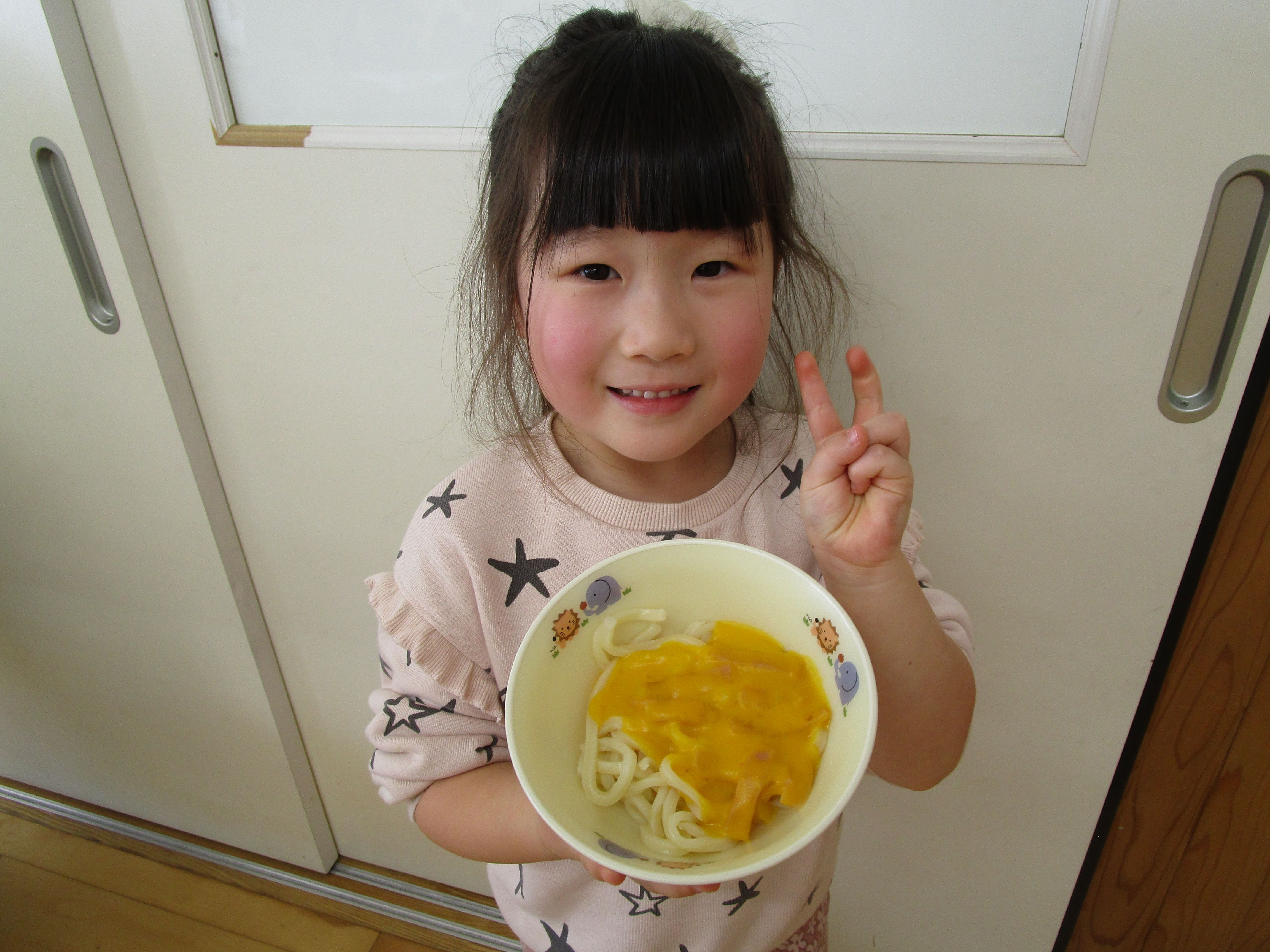 12月26日の給食はベーコンとかぼちゃをたくさん使用した かぼちゃクリームうどんを提供しました♪ 「うどんのク…