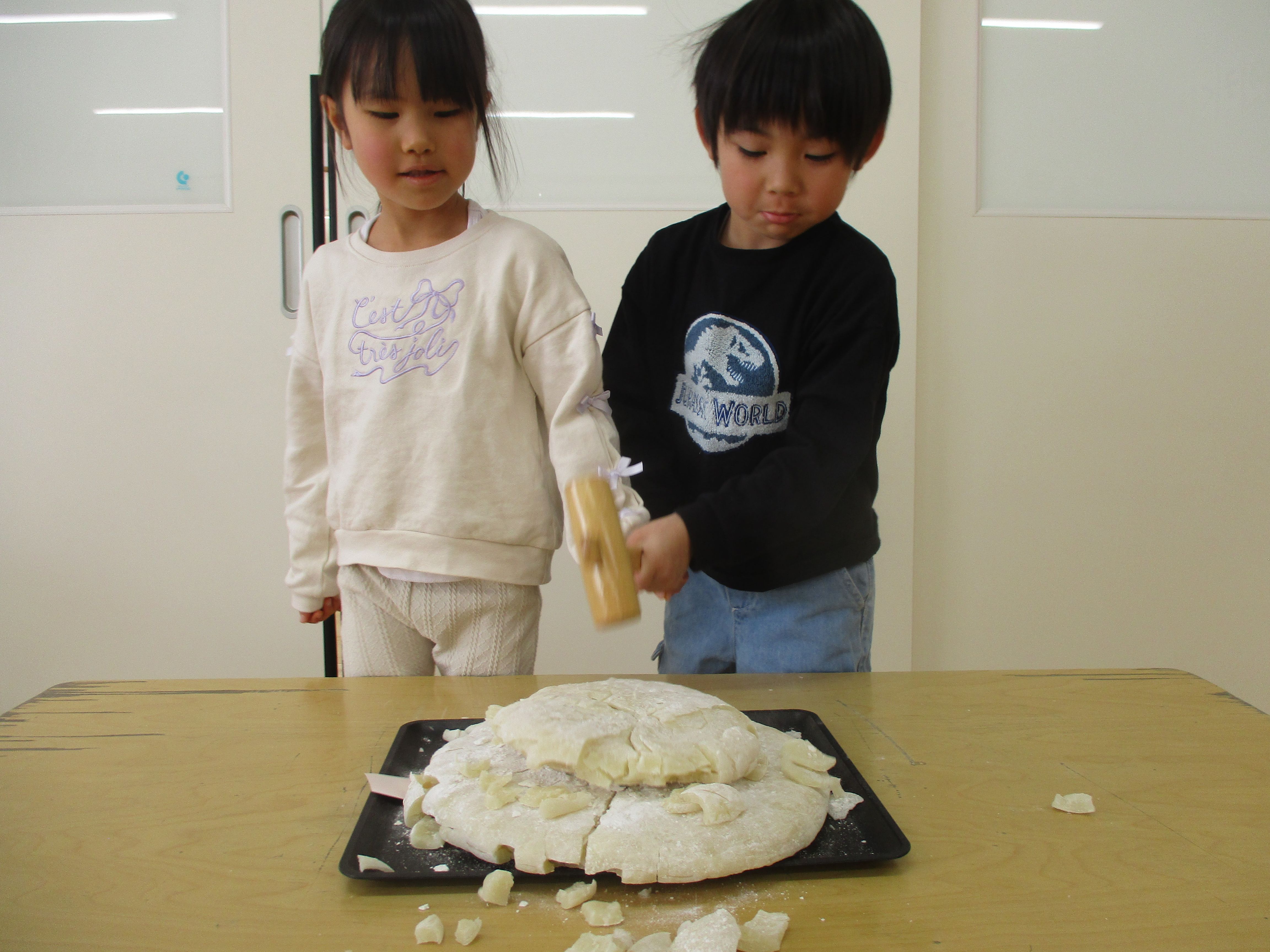 鏡開きを行いました。 神様が宿るお餅を木槌で叩いて割っていきます。 …