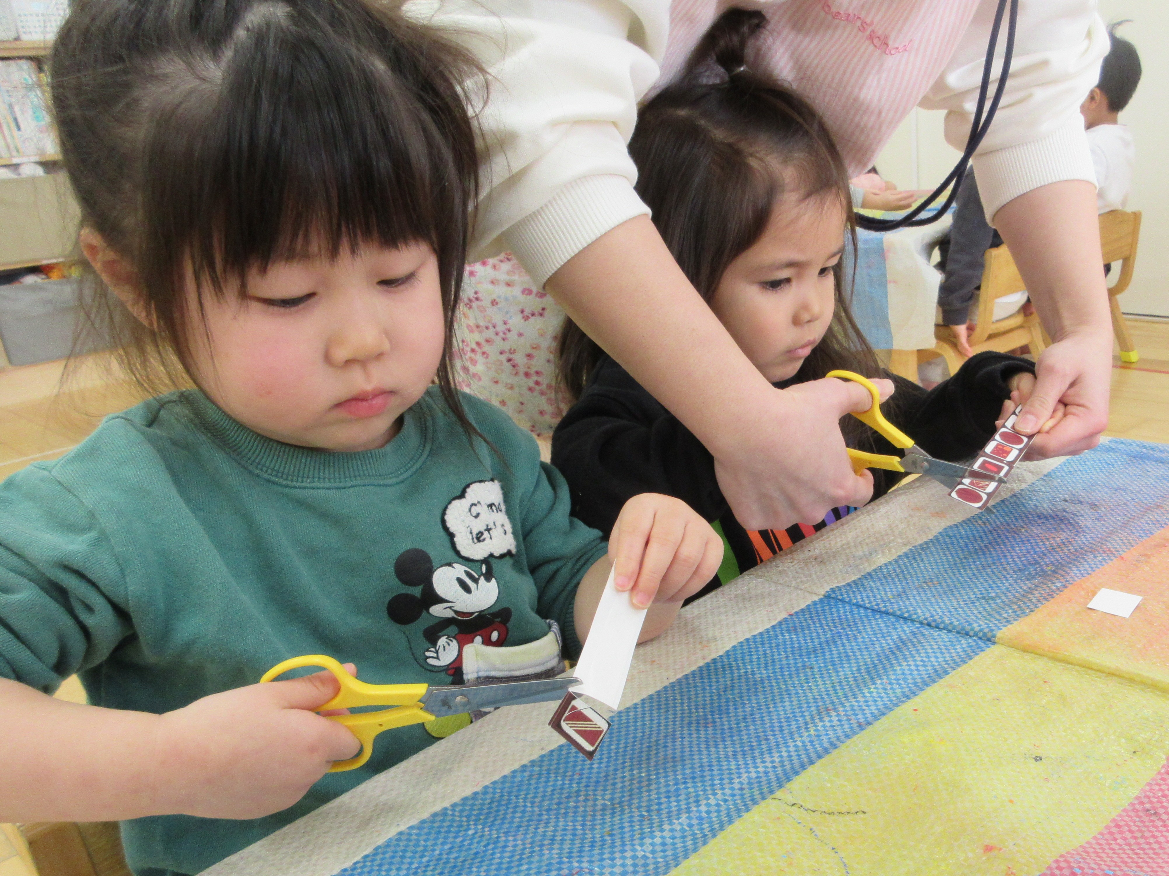 バレンタイン製作をしました🎵 ハサミを使い、チョコレートを切り分けます✂ お約束を守り、上手に切ることが出来ま…