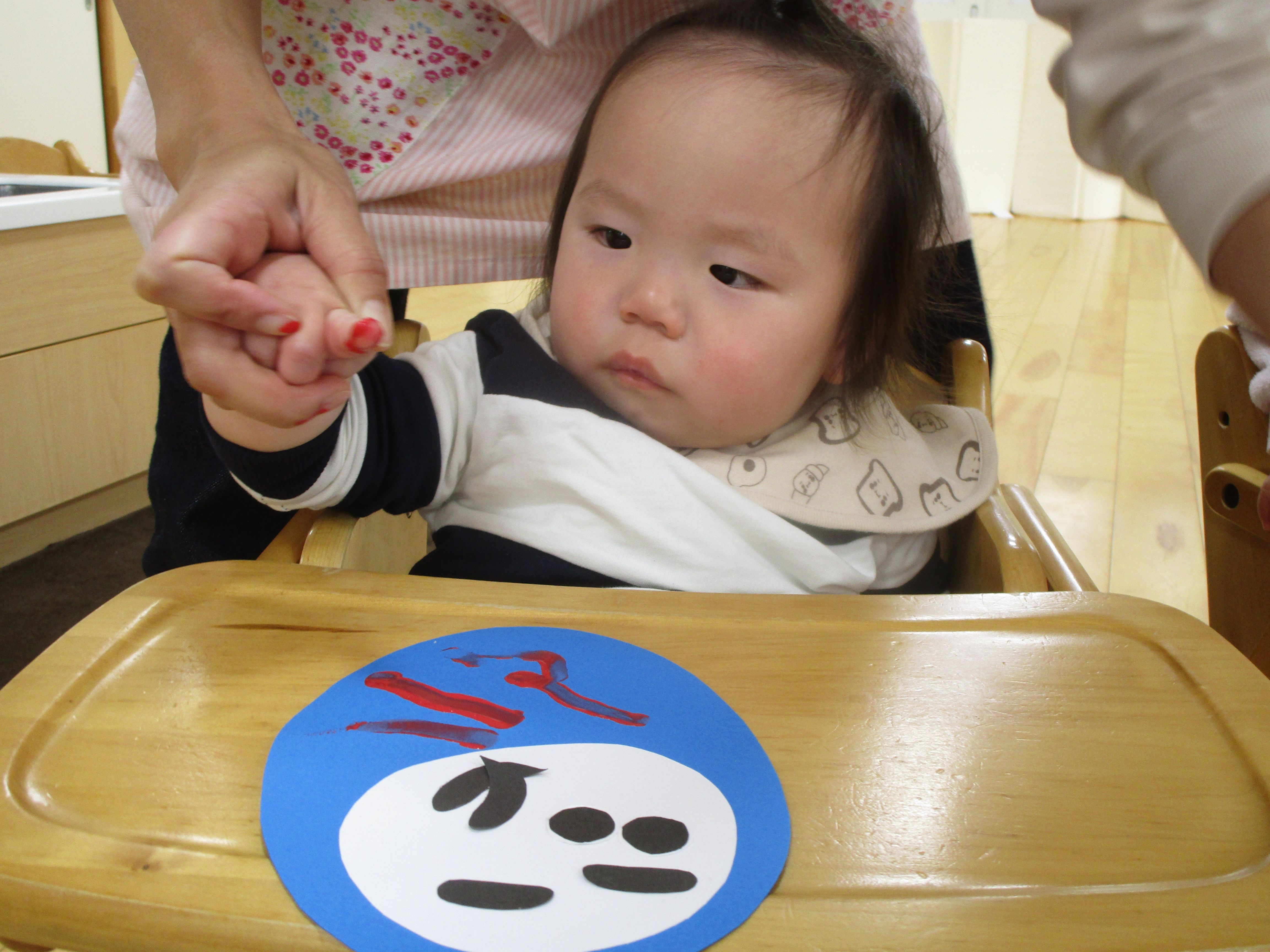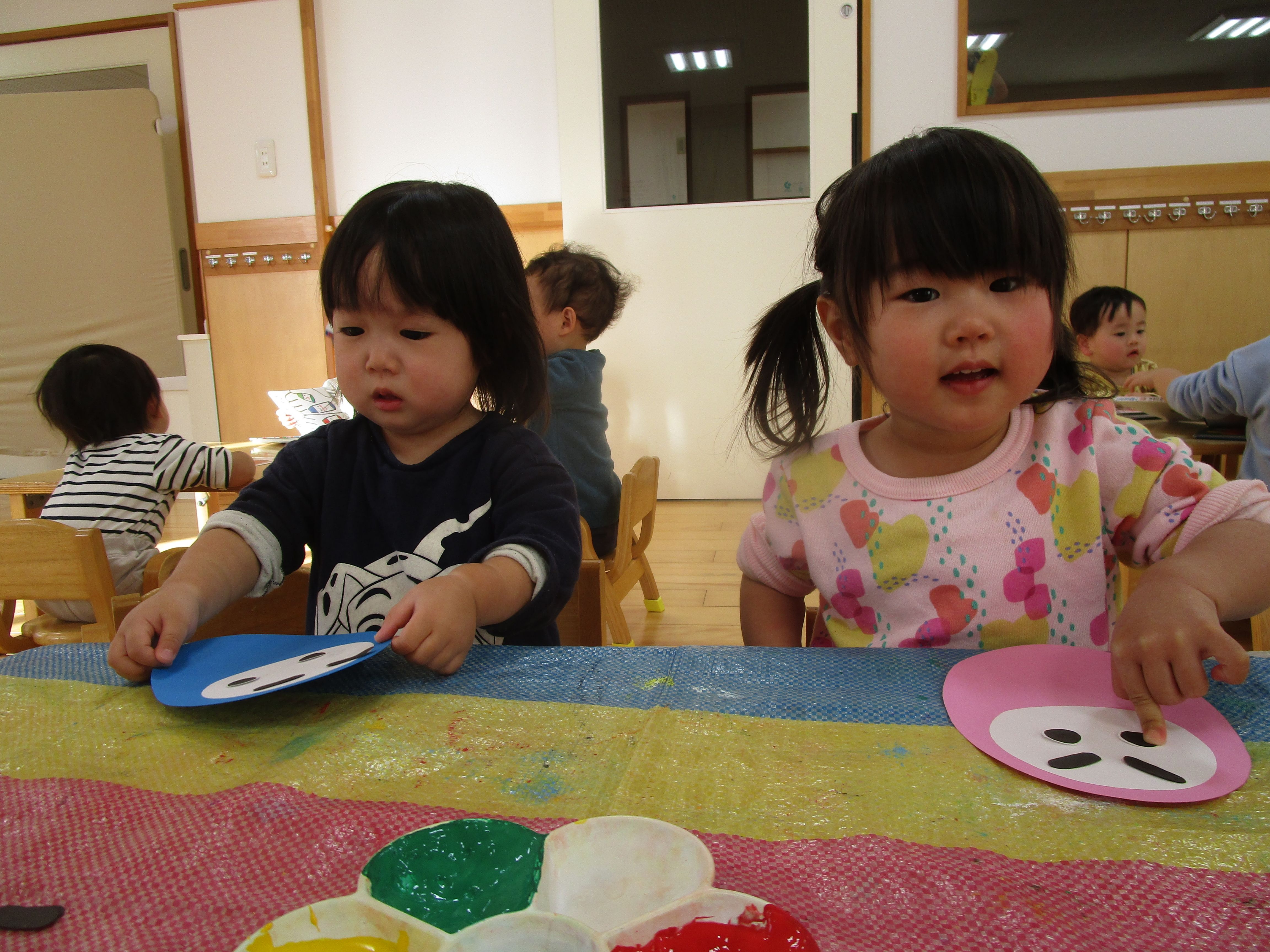 指に付いた絵の具をみて不思議そうな星の子くみさん。