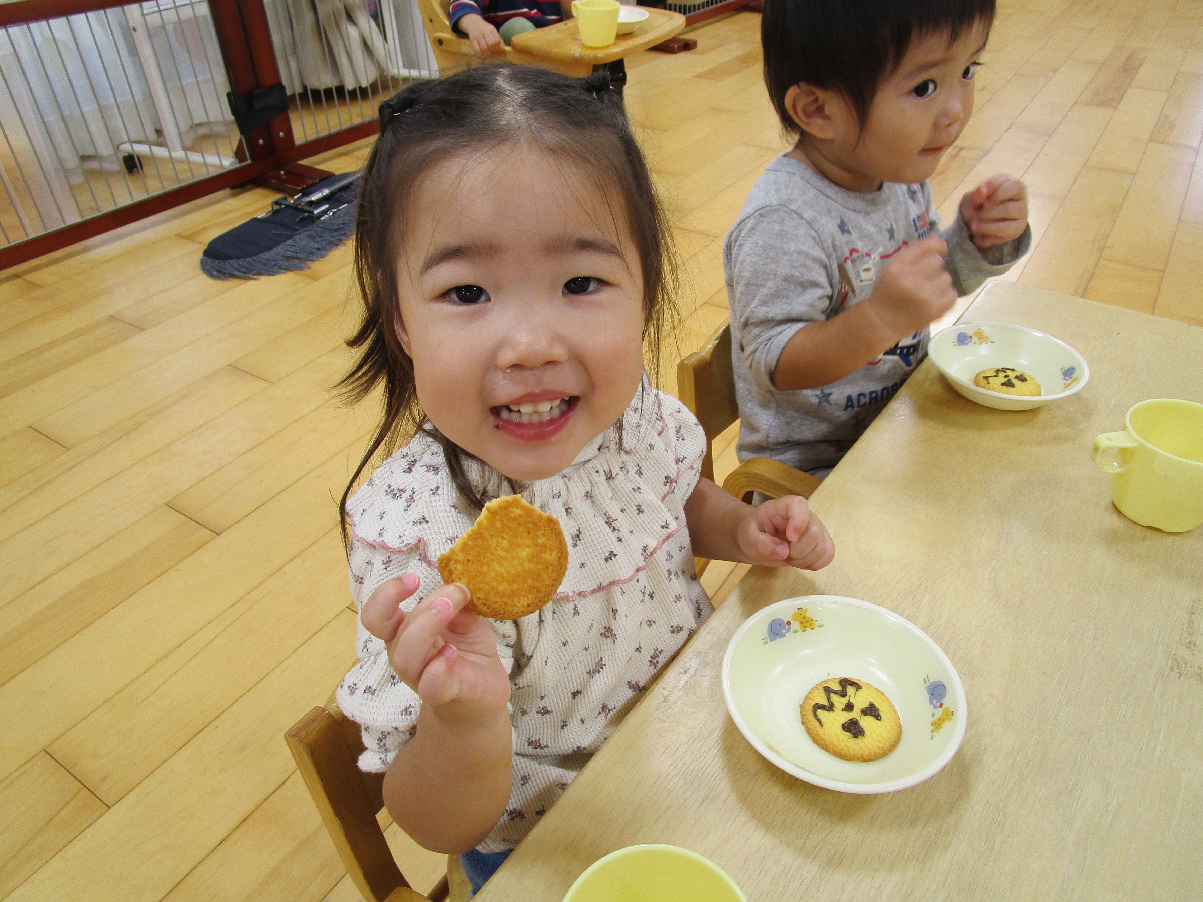 10月31日のおやつはクッキーにチョコペンでおばけの顔を書いて提供しました♪