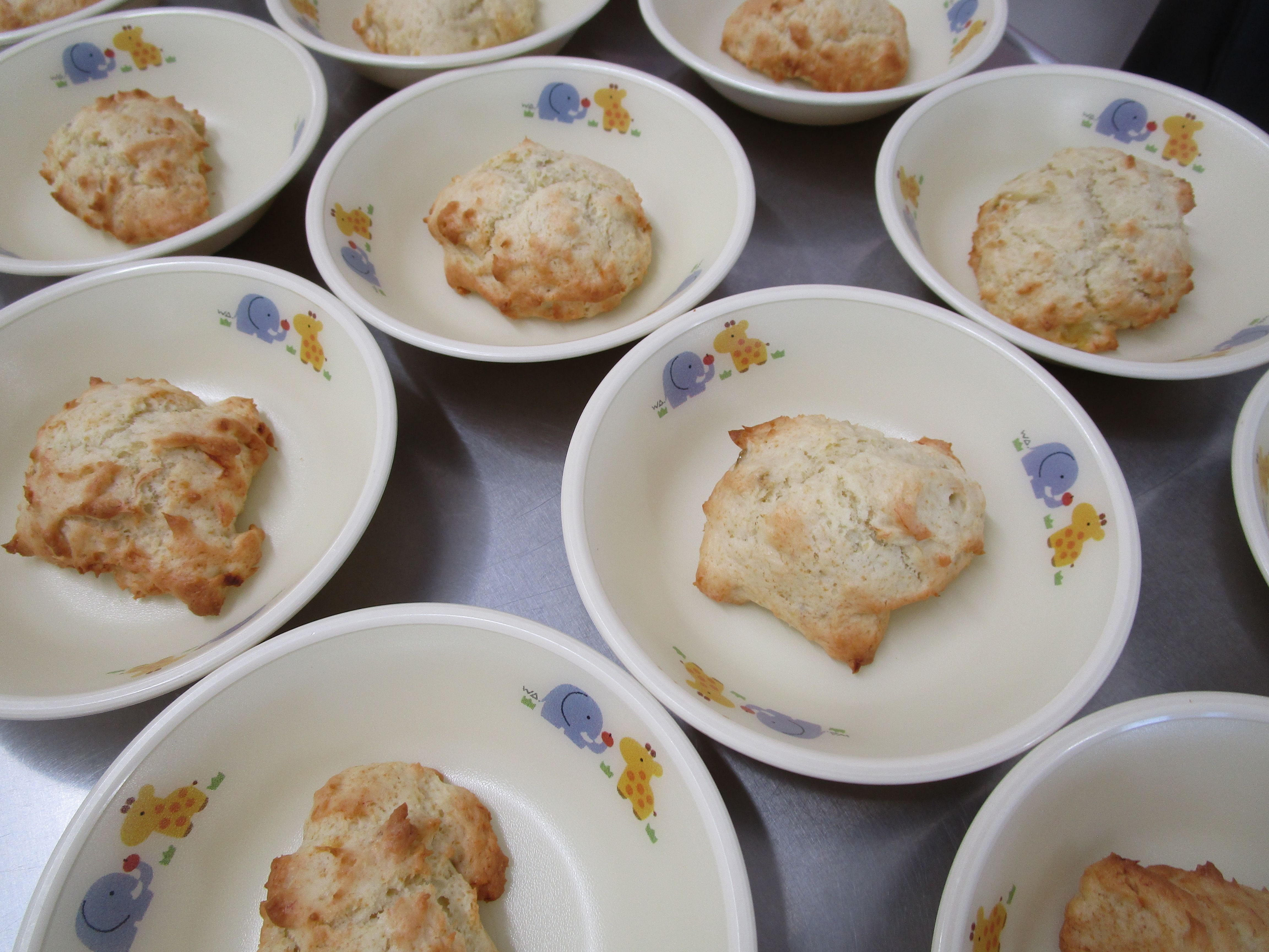 チョコ味やノーマル味のスコーンを提供することが多くありますが、今回初めてバナナ味のスコーンを提供しました。これからも子ども達に給食やおやつで色々なものを提供していきます💚