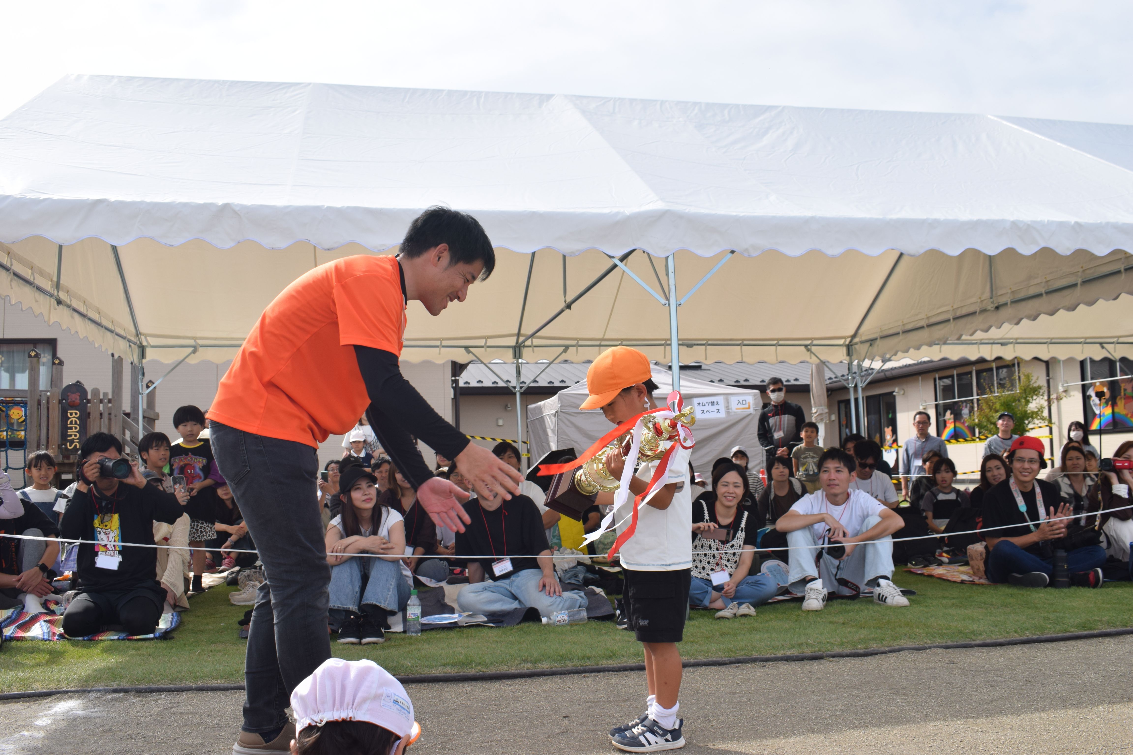 今年の運動会は紅組の勝ち!トロフィーを受け取ります!