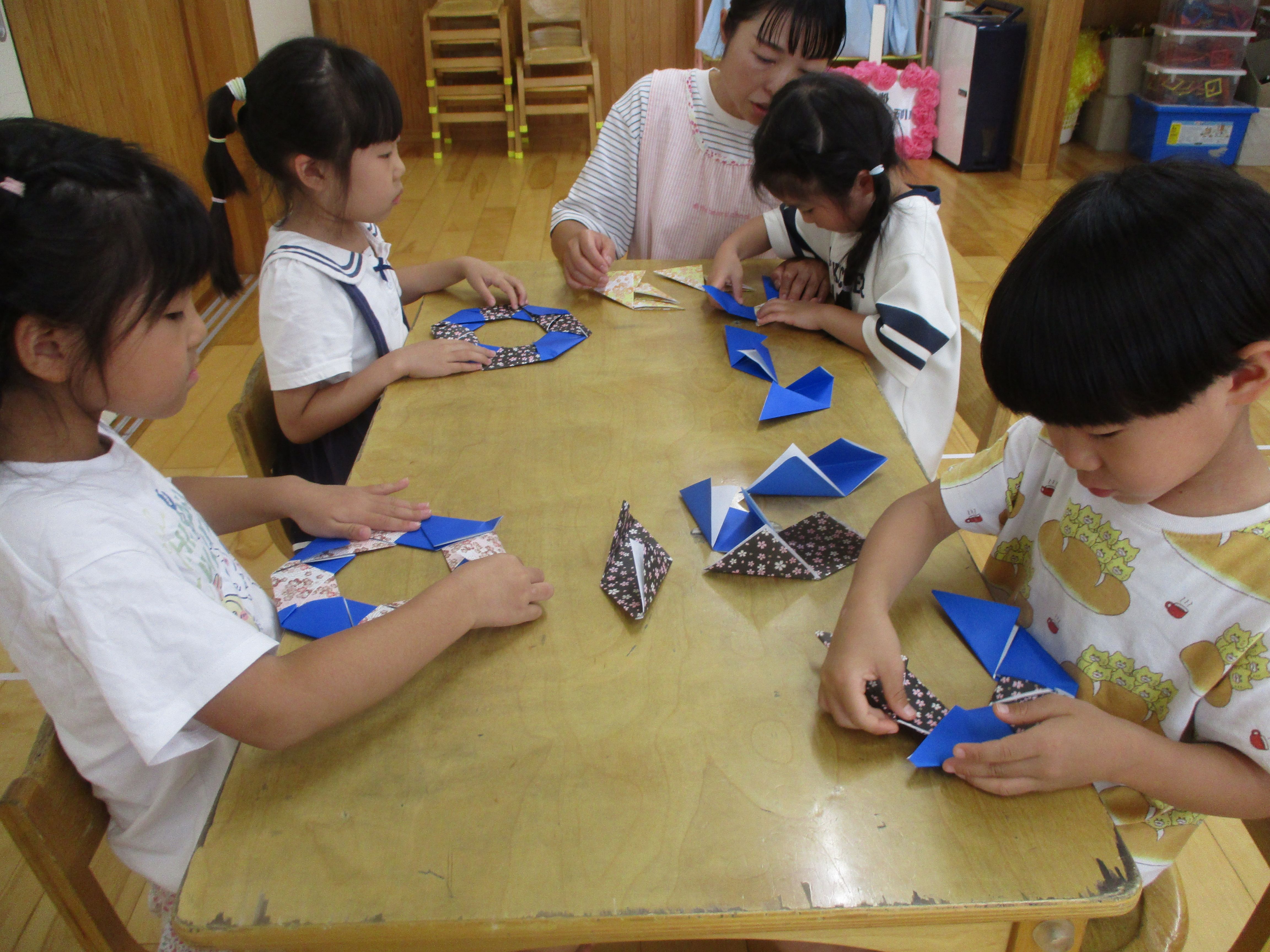 8枚の折り紙を同じ形に折っていき、組み合わせてリースの形にします。