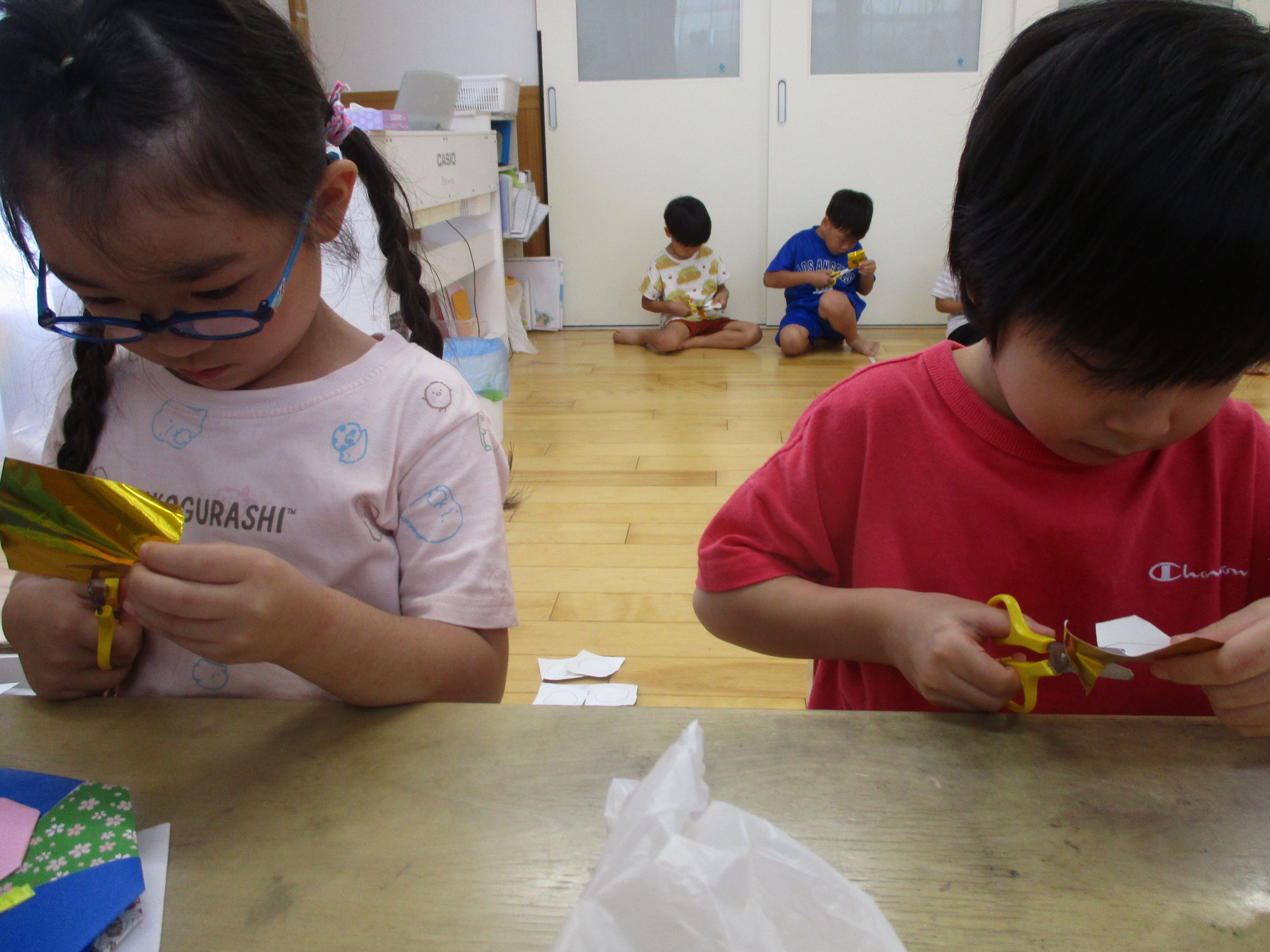 丸型が書いてある金色の折り紙を切ってお月様を作ります。