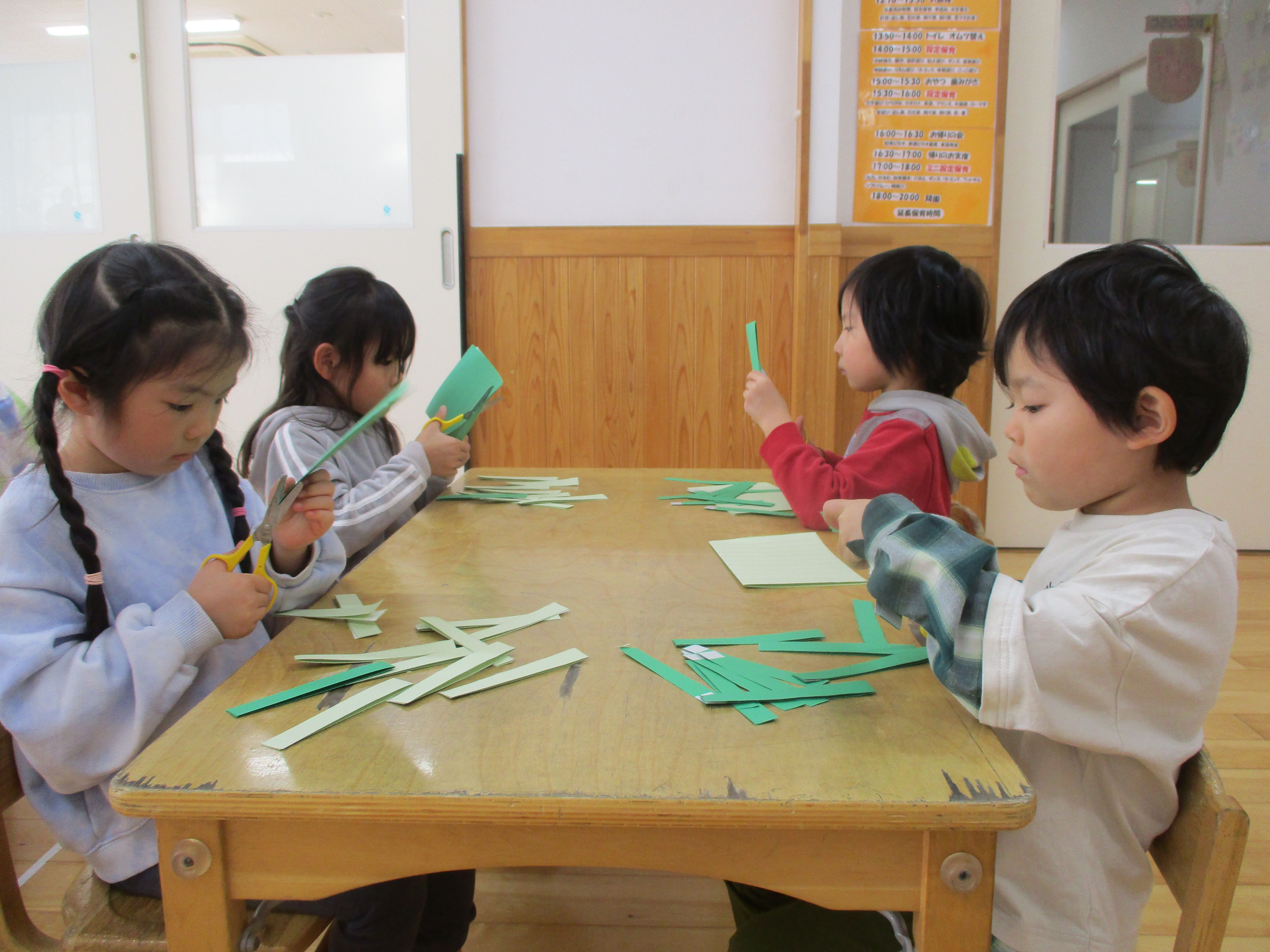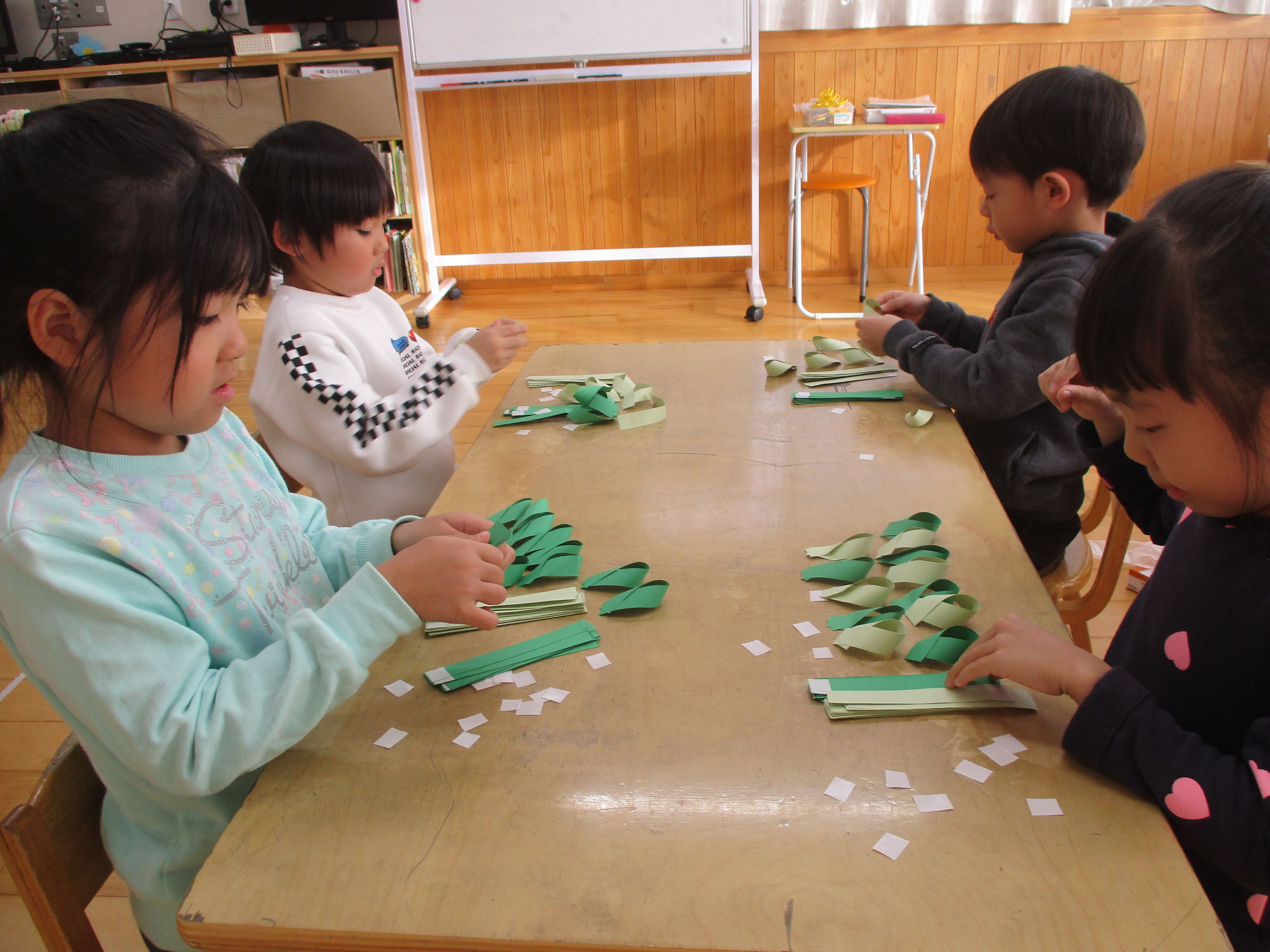 切った画用紙を葉のように丸めて、リースのパーツを作ります。
