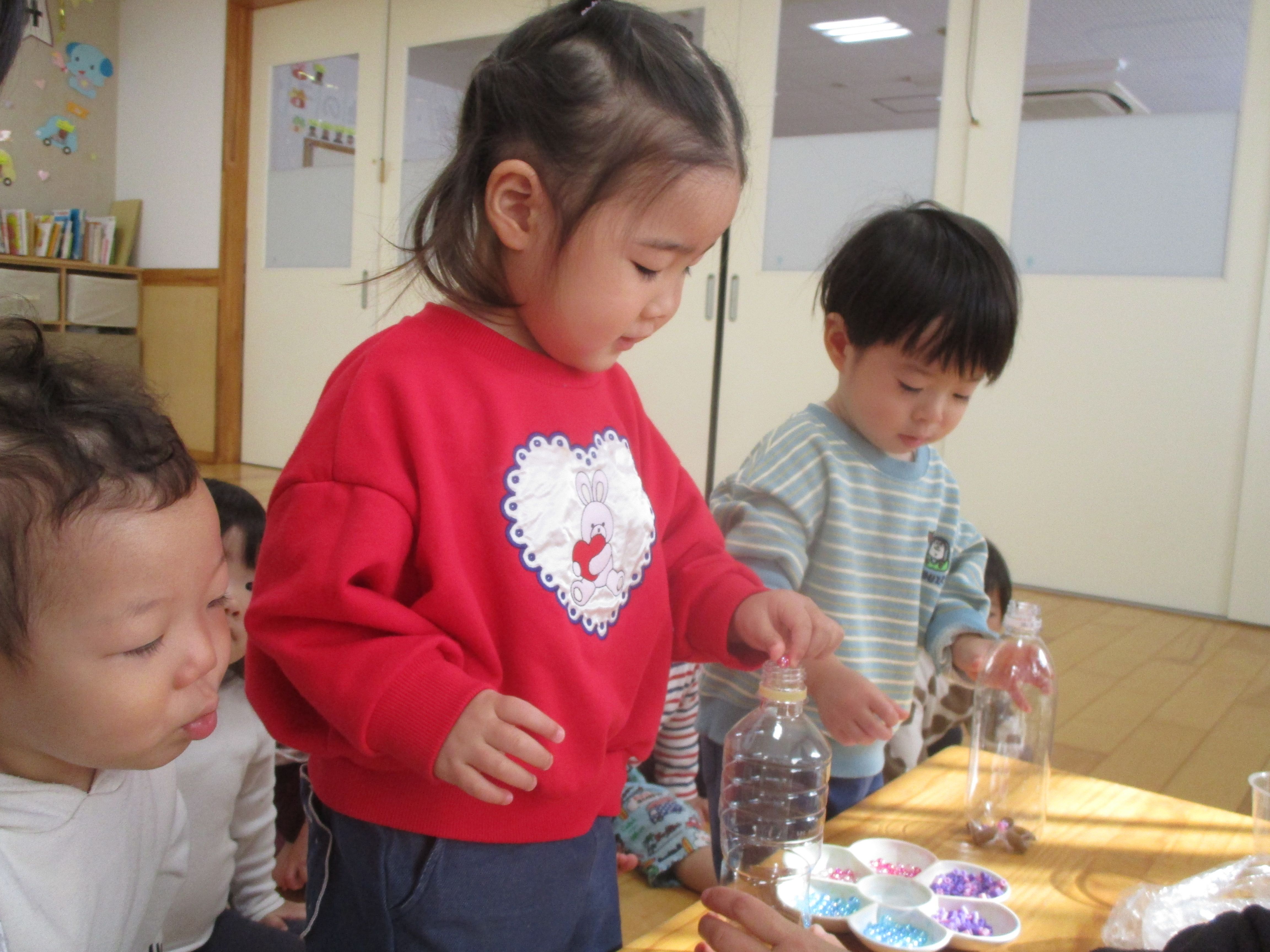 1つずつ丁寧につまんでペットボトルに入れる子どもたち。