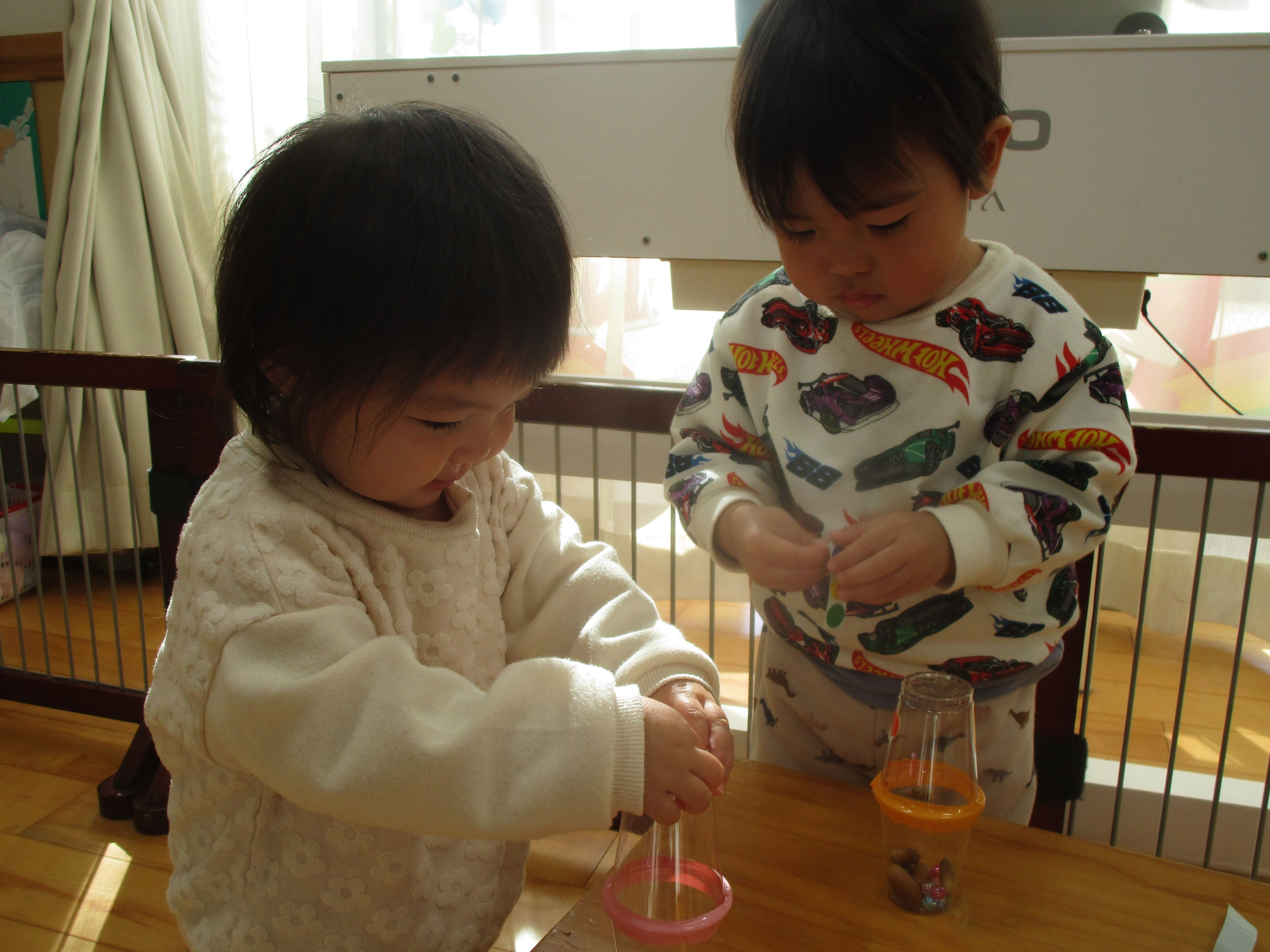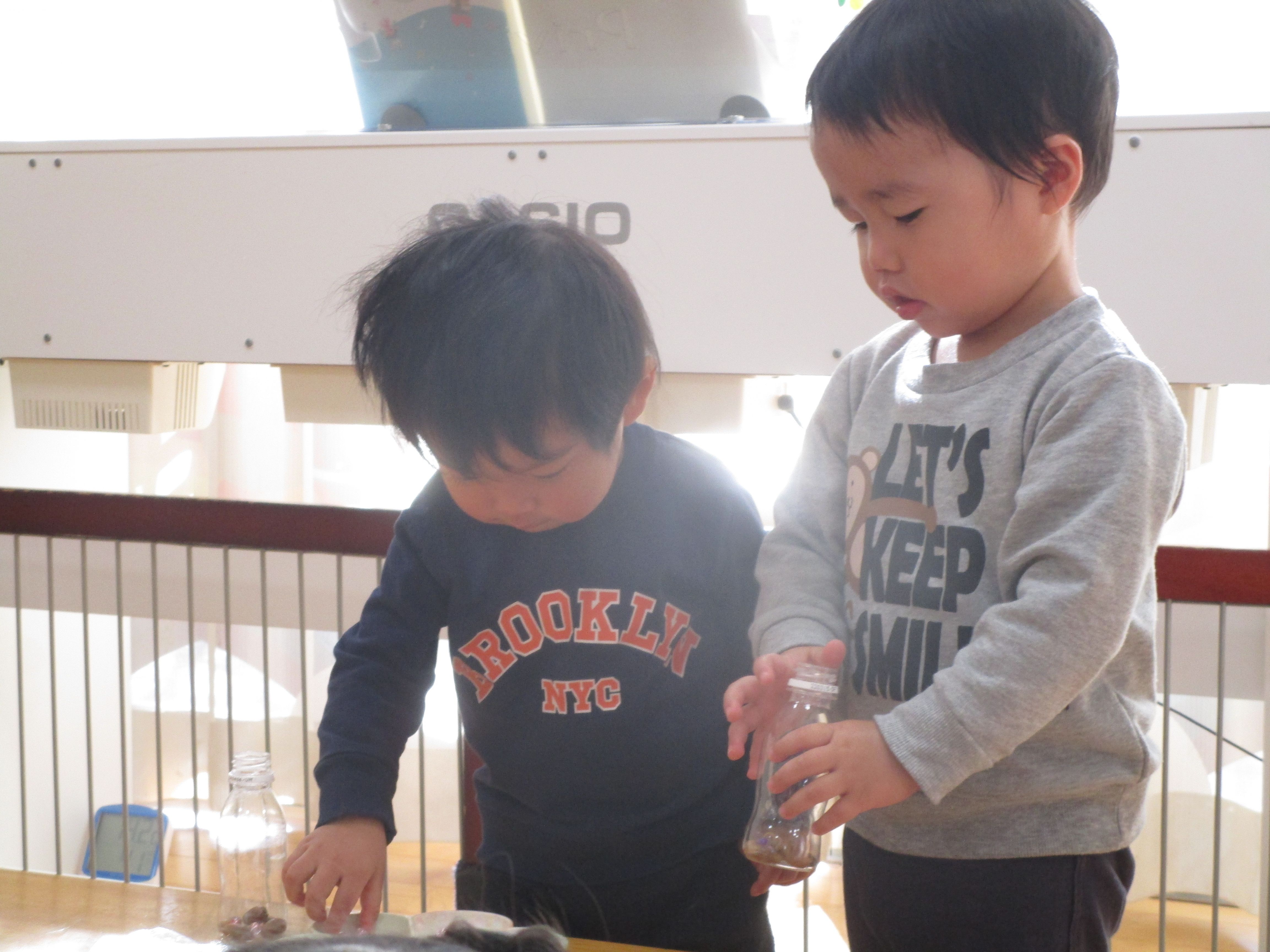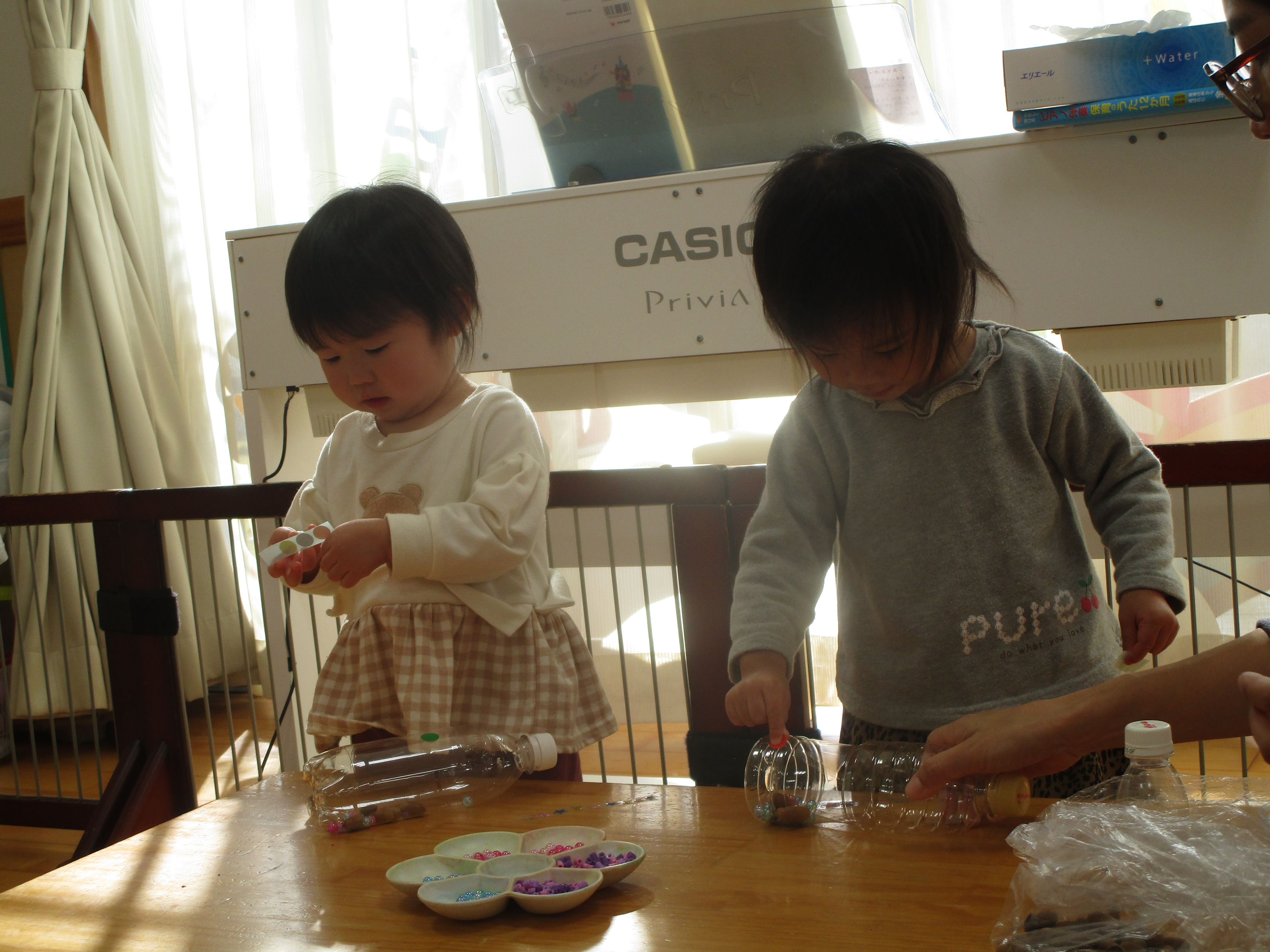どんぐりやビーズをペットボトルに入れ、みんなで力を合わせてマラカスを作りました。