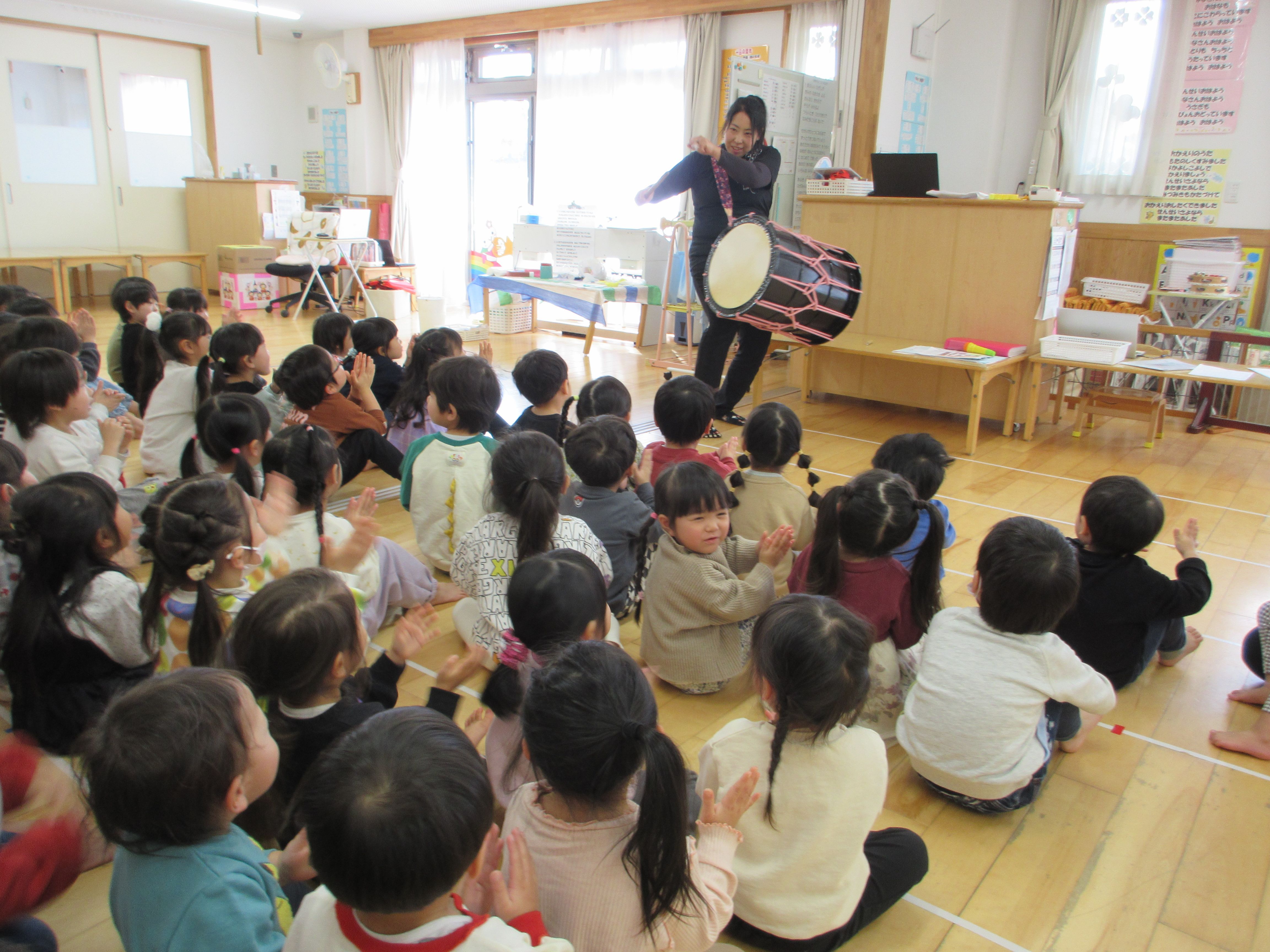 桶胴太鼓という楽器の演奏を聴いて、一緒に手拍子でリズム遊びをしました👏